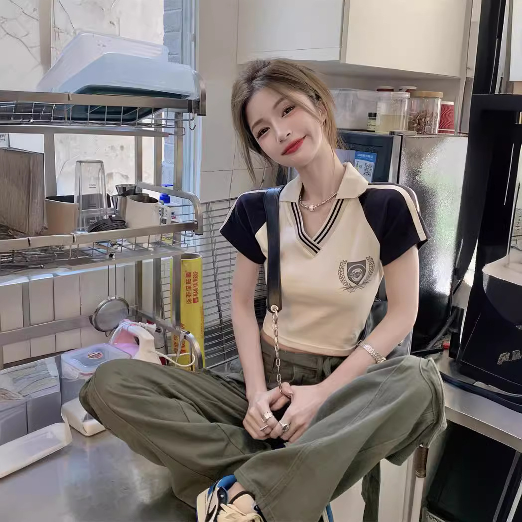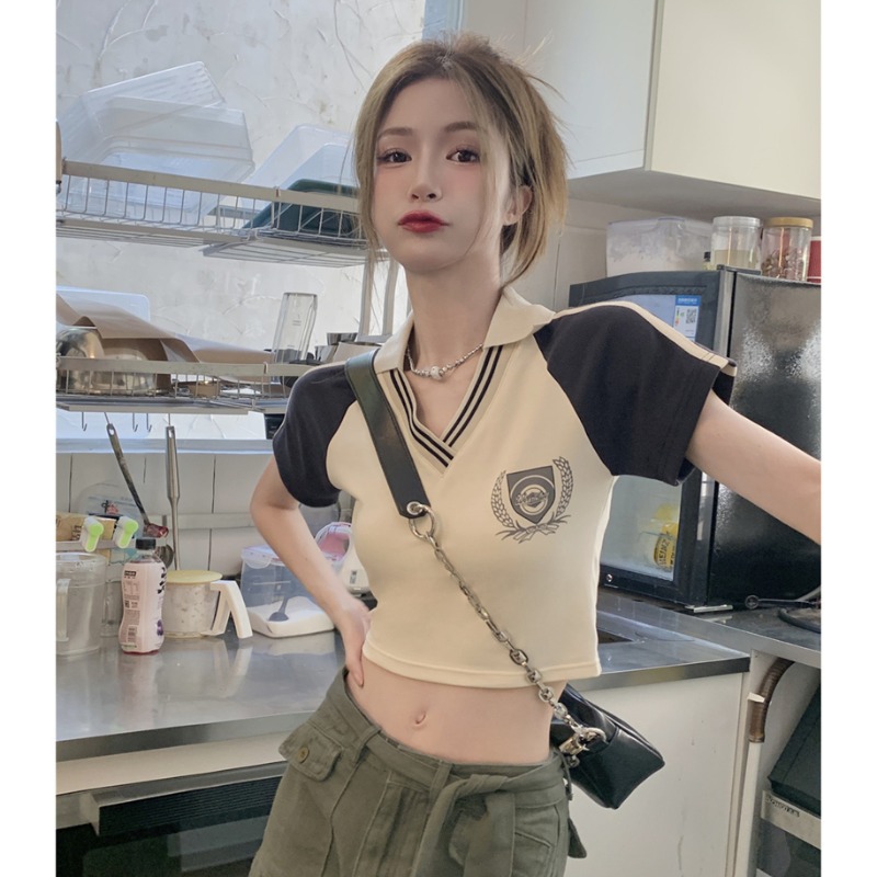纯棉Polo领显瘦学院风设计感修身短款欧美辣妹上衣