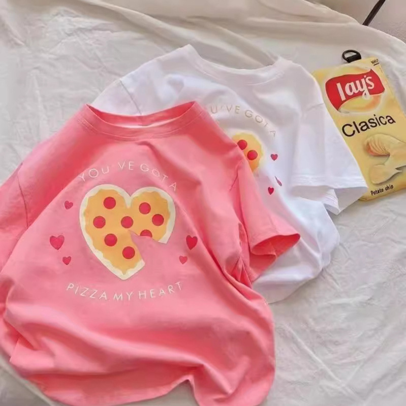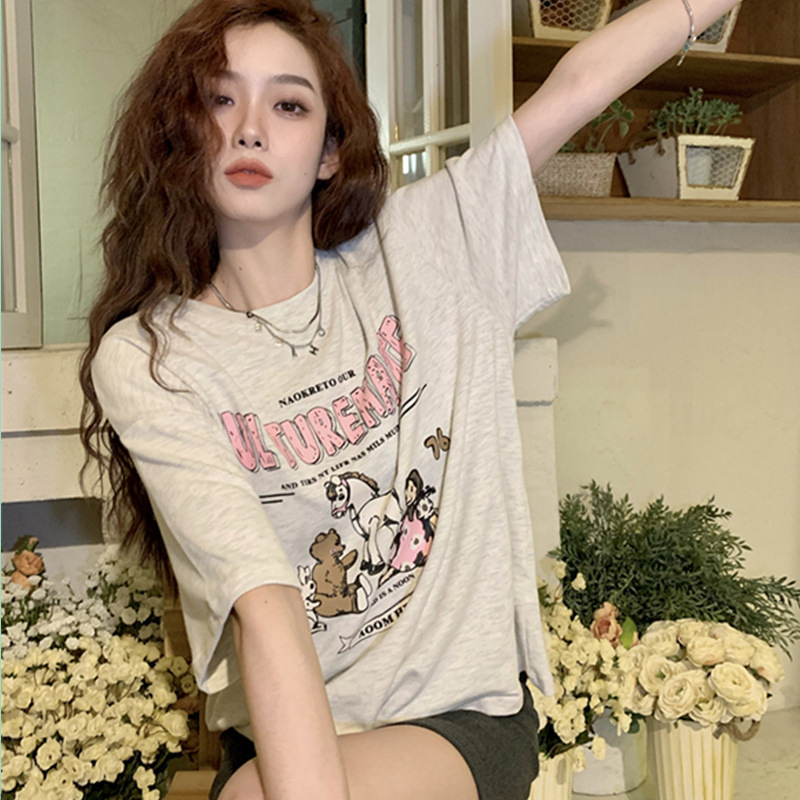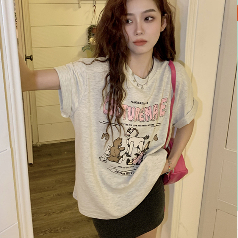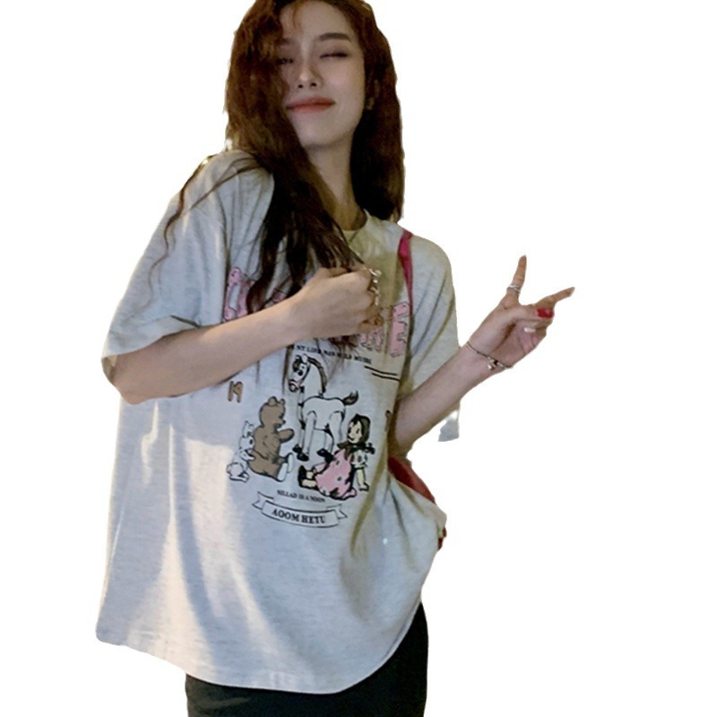 日系宽松ins潮休闲中长款短袖T恤女卡通印花学院风上衣