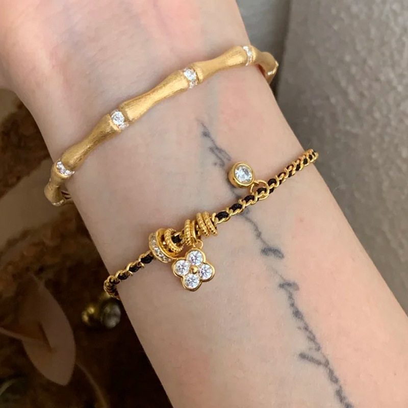 小红书同款新中式国潮点钻四叶花黑金手链小众百搭高级感编织手链