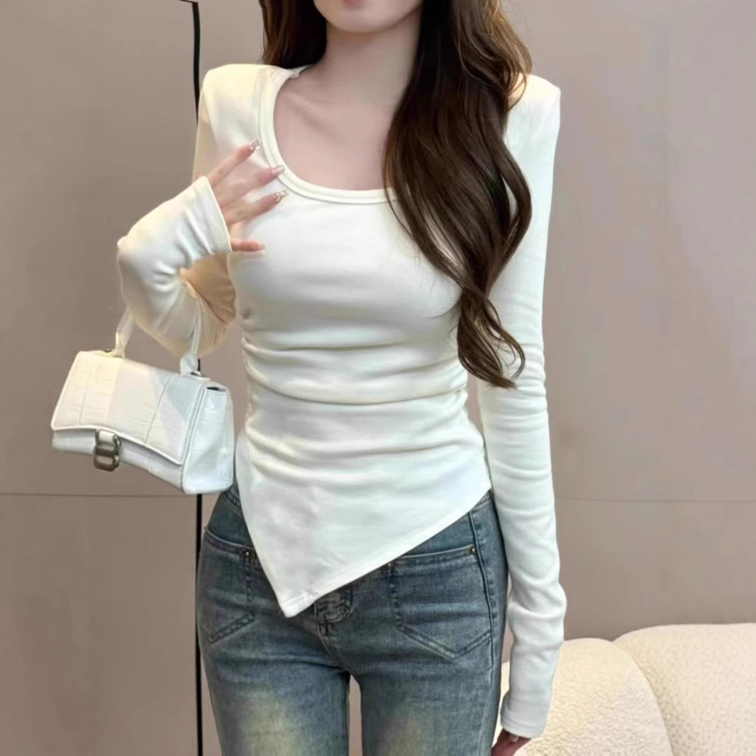 2025新款德绒辣妹U领锁骨上衣女春秋正肩内搭长袖不规则打底衫T恤