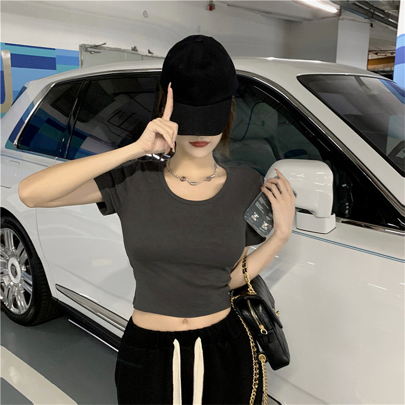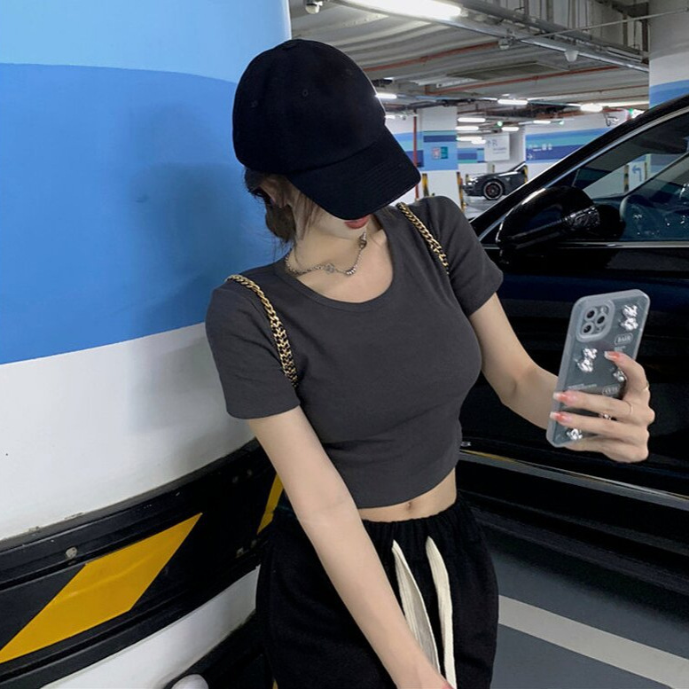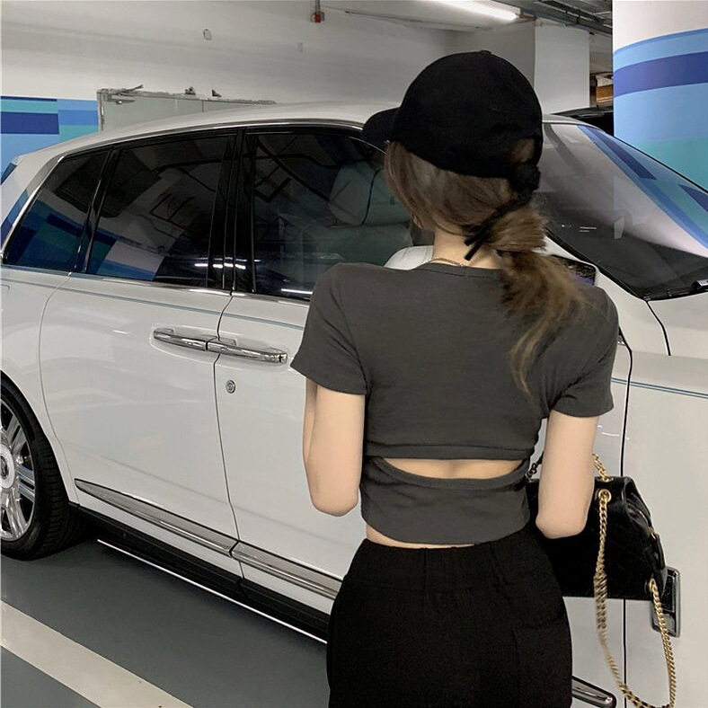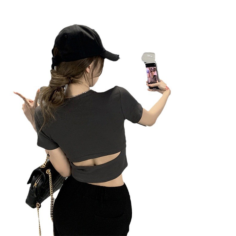 短款露背甜辣小个子罗纹新款设计感小众别致甜辣短款T恤女