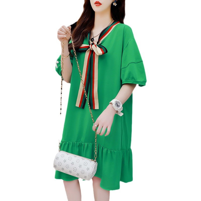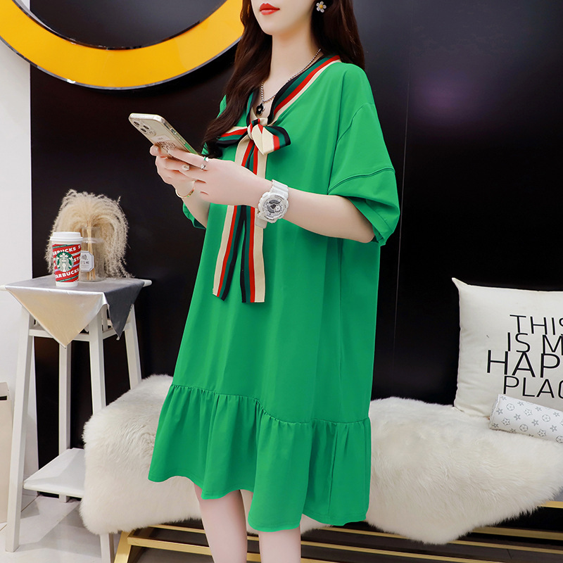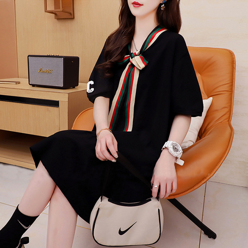 新款短袖t恤女中长款夏季遮肉系带连衣裙宽松大码女装上衣潮