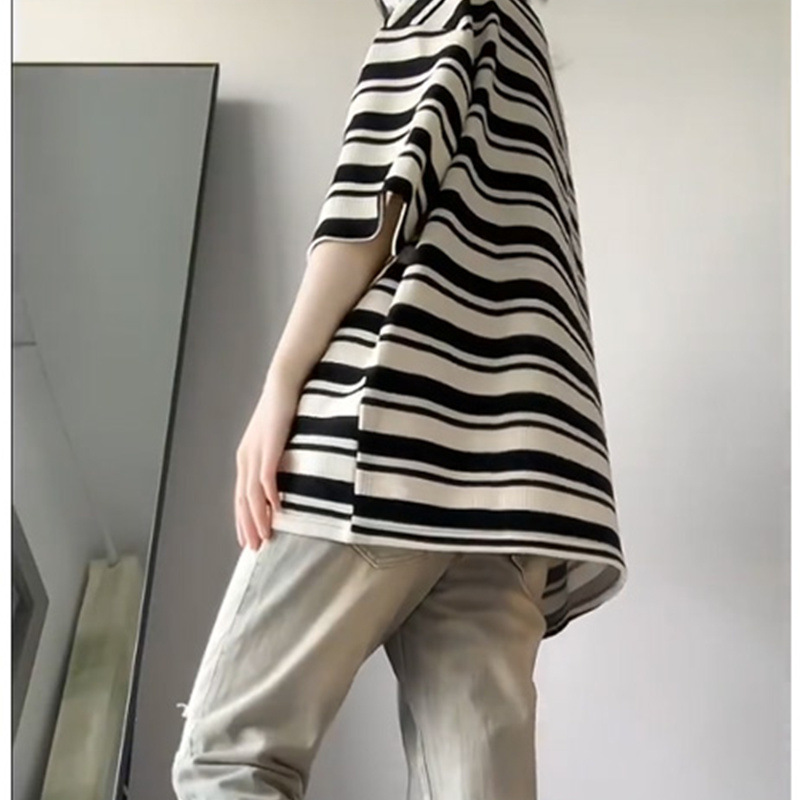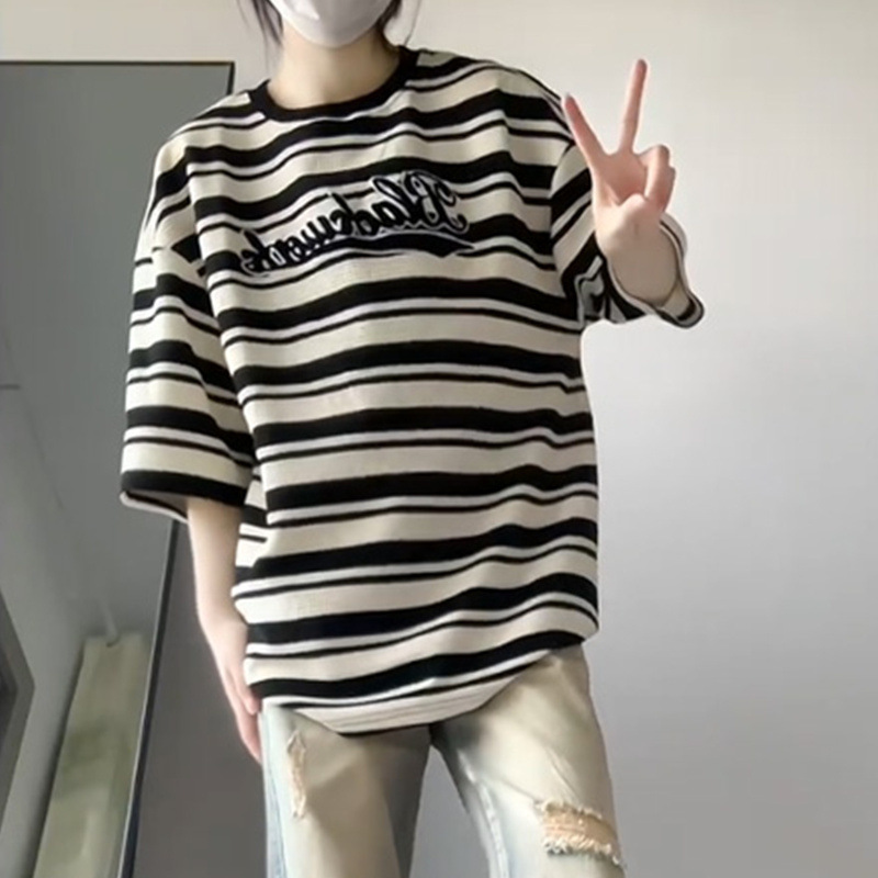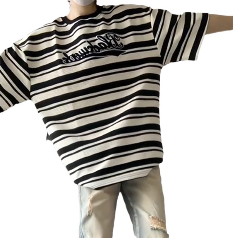 日系ins潮休闲华夫格复古条纹短袖t恤女情侣闺蜜上衣