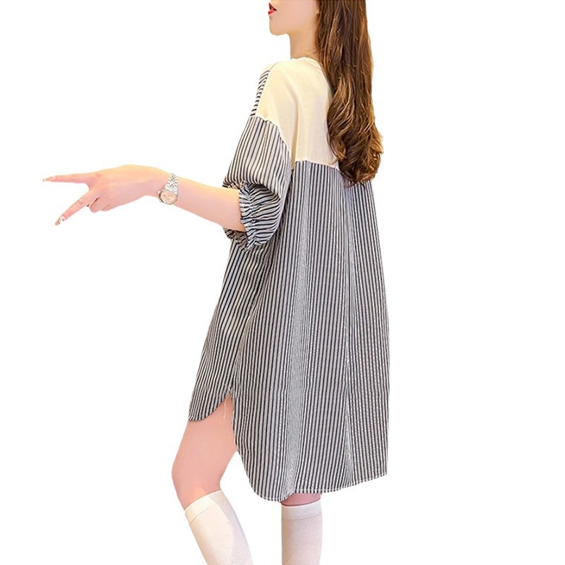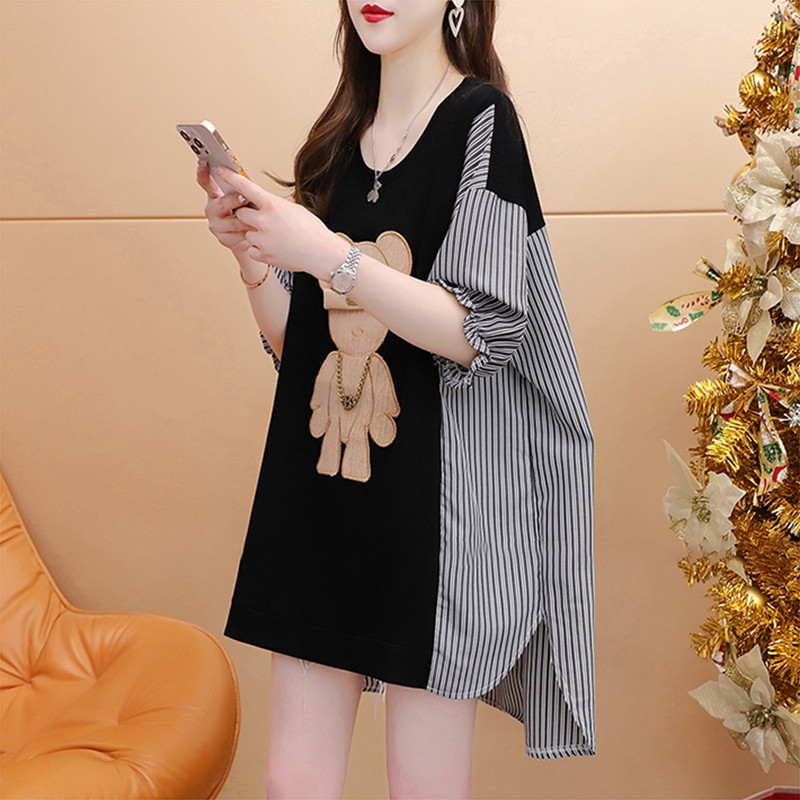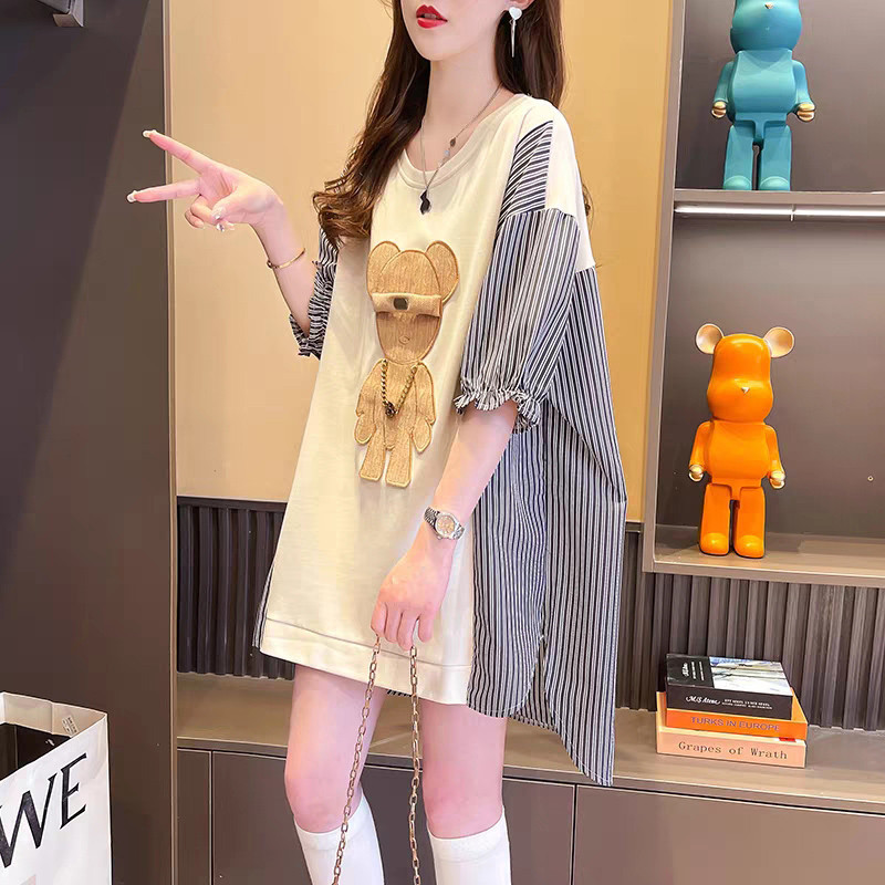 设计感拼接短袖T恤女中长款新款夏季洋气减龄宽松慵懒风上衣