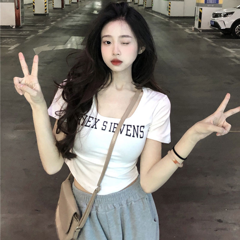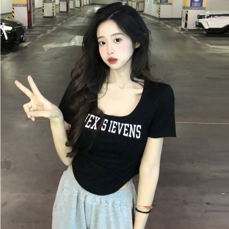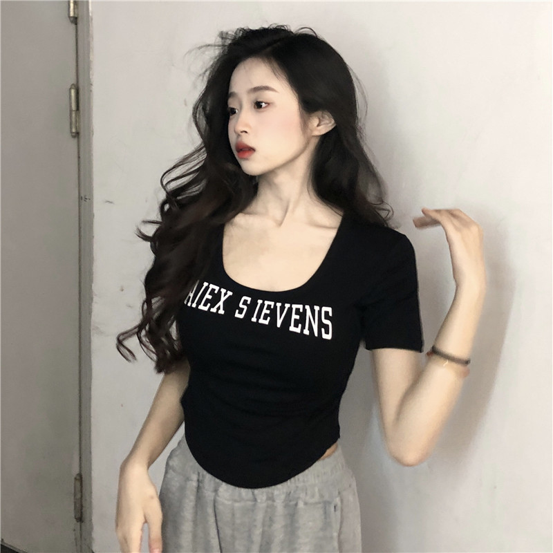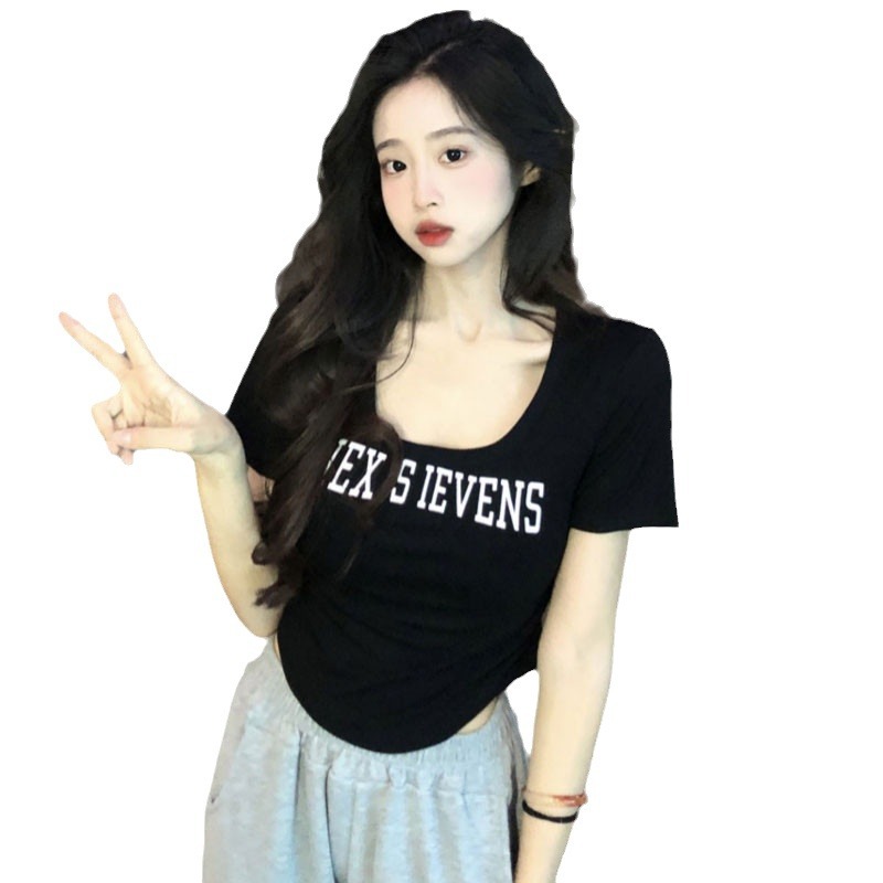不规则白色u领短袖t恤女夏夏季修身紧身显瘦半袖高腰短款纯棉上衣