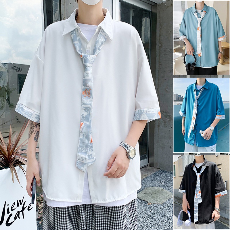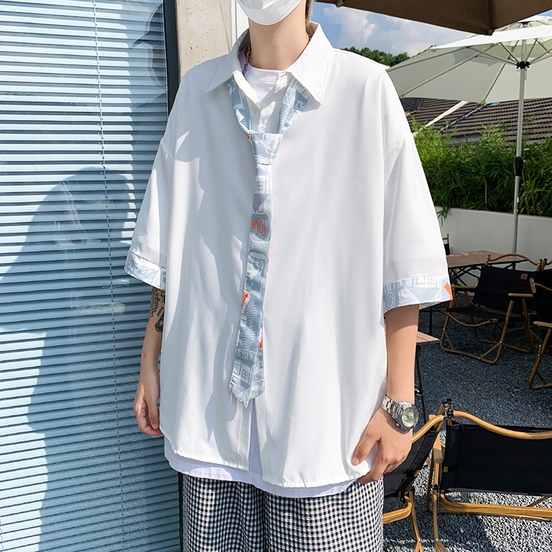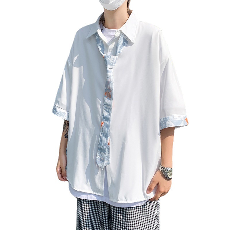 痞帅七分袖衬衣男士夏季宽松冰丝短袖衬衫潮流ins设计感小众上衣T