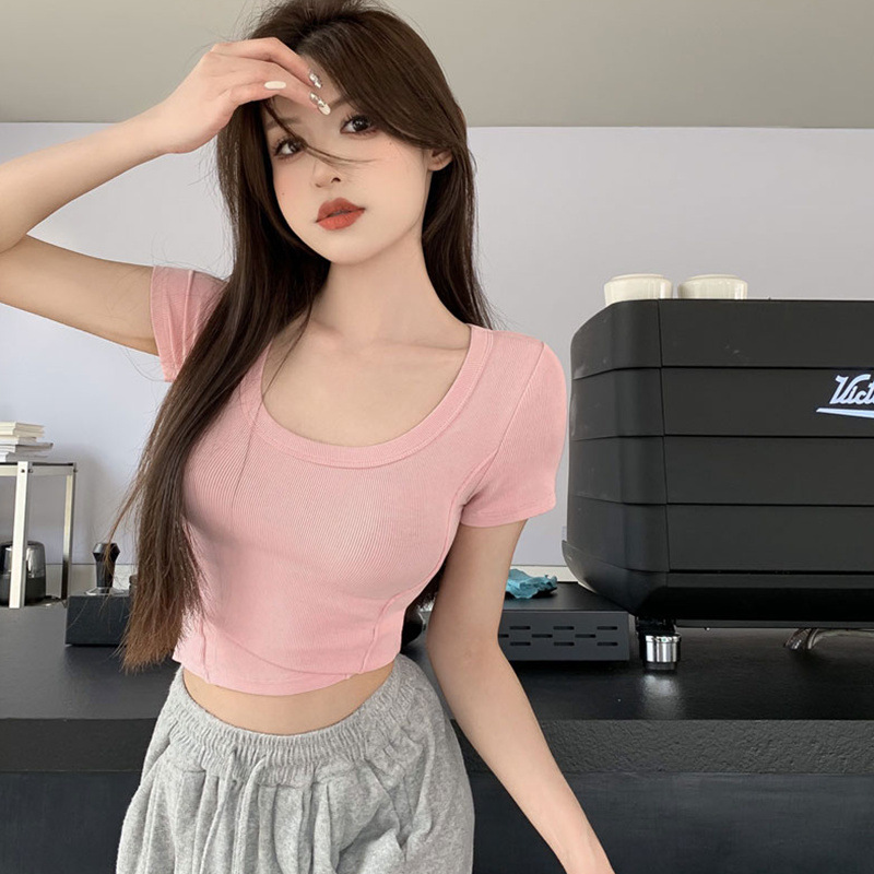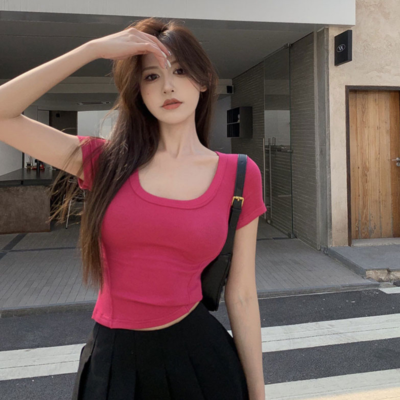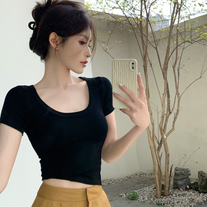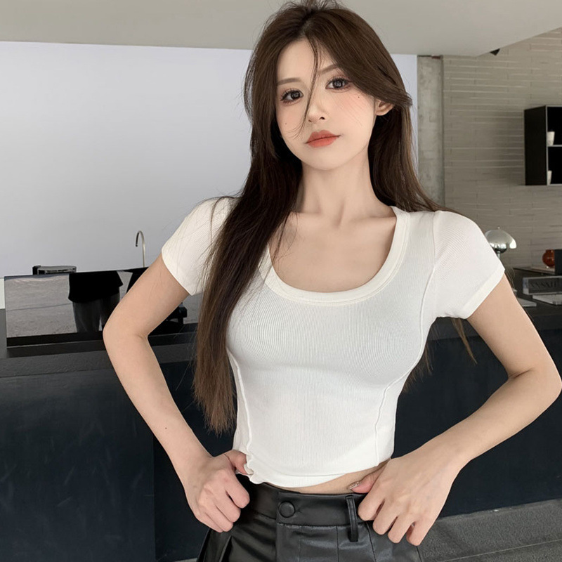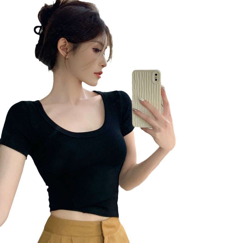 辣妹u领短袖T恤女夏季纯欲风短款露脐紧身显瘦打底衫白色正肩上衣