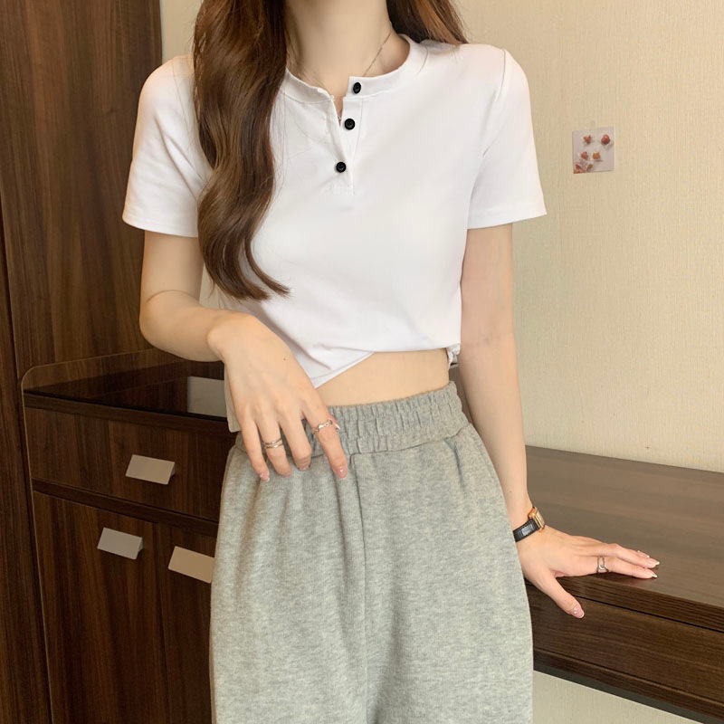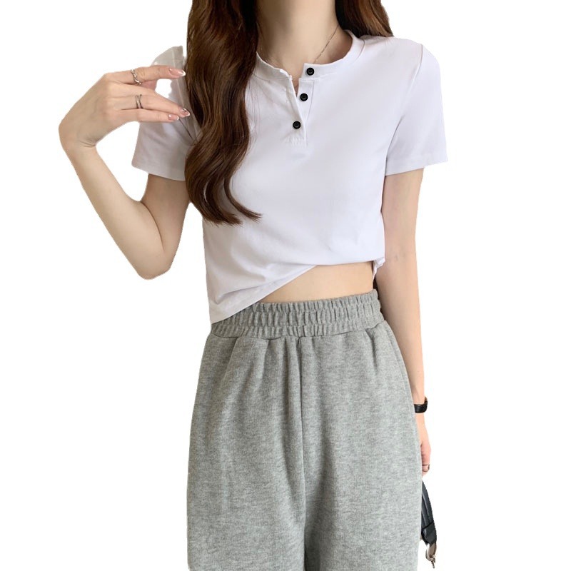 螺纹纯色短款t恤衫女修身显瘦露脐圆领辣妹上衣