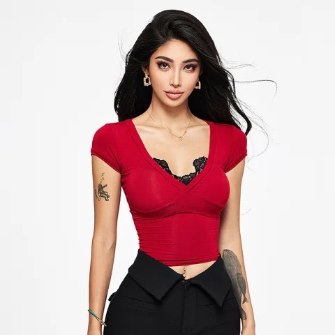 纯欲辣妹蕾丝花边V领正肩短袖T恤女2025夏季纯棉修身百搭短款上衣
