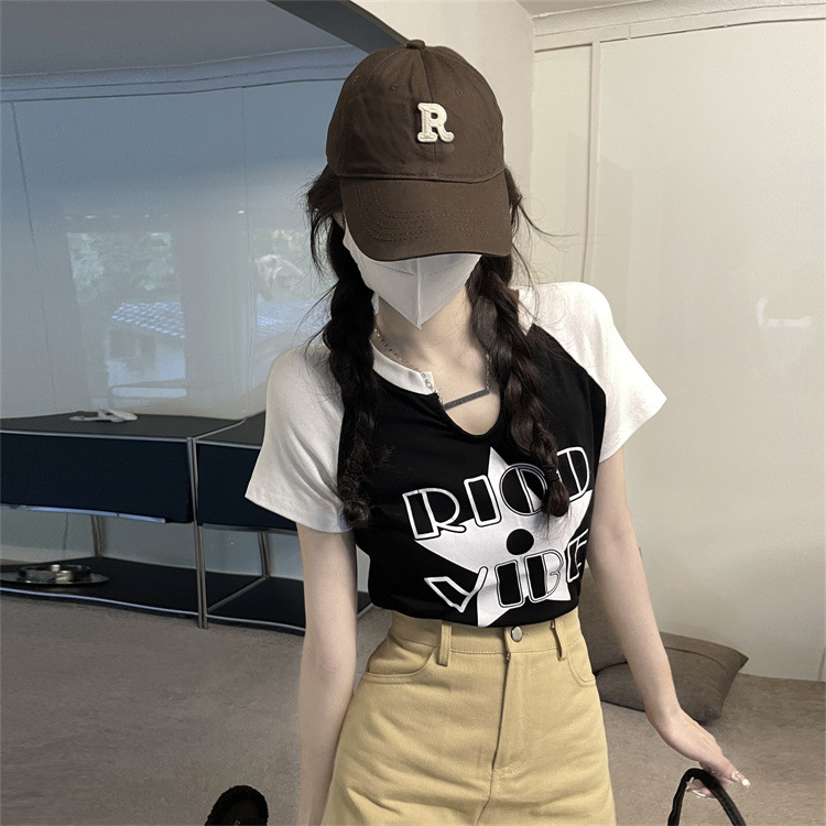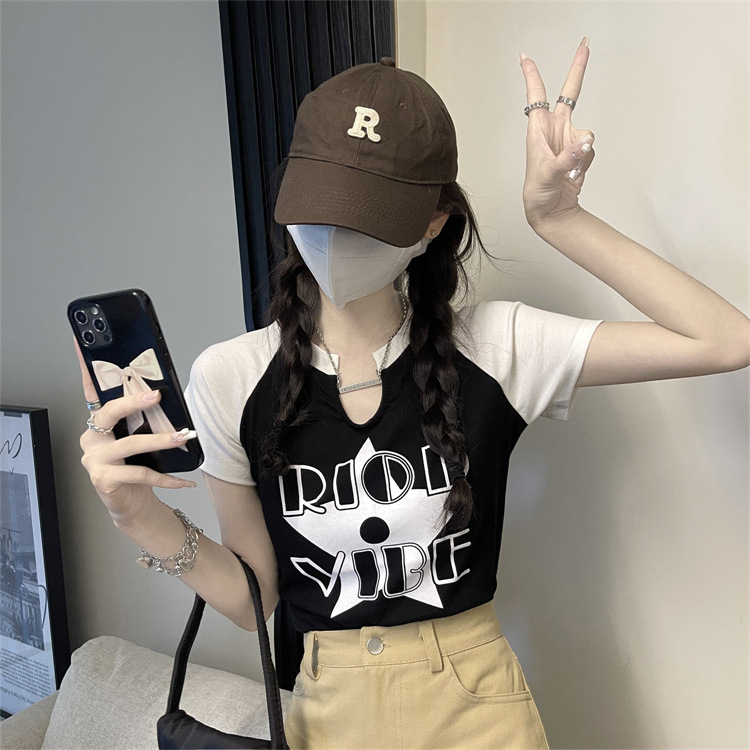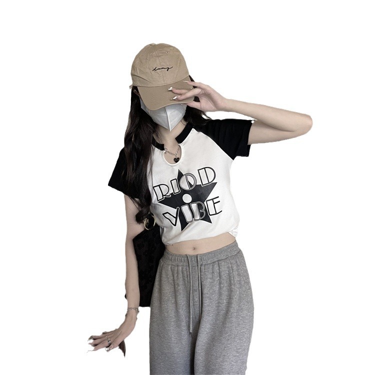 短款小众设计感新款纯棉撞色插肩袖短袖修身露脐上衣ins