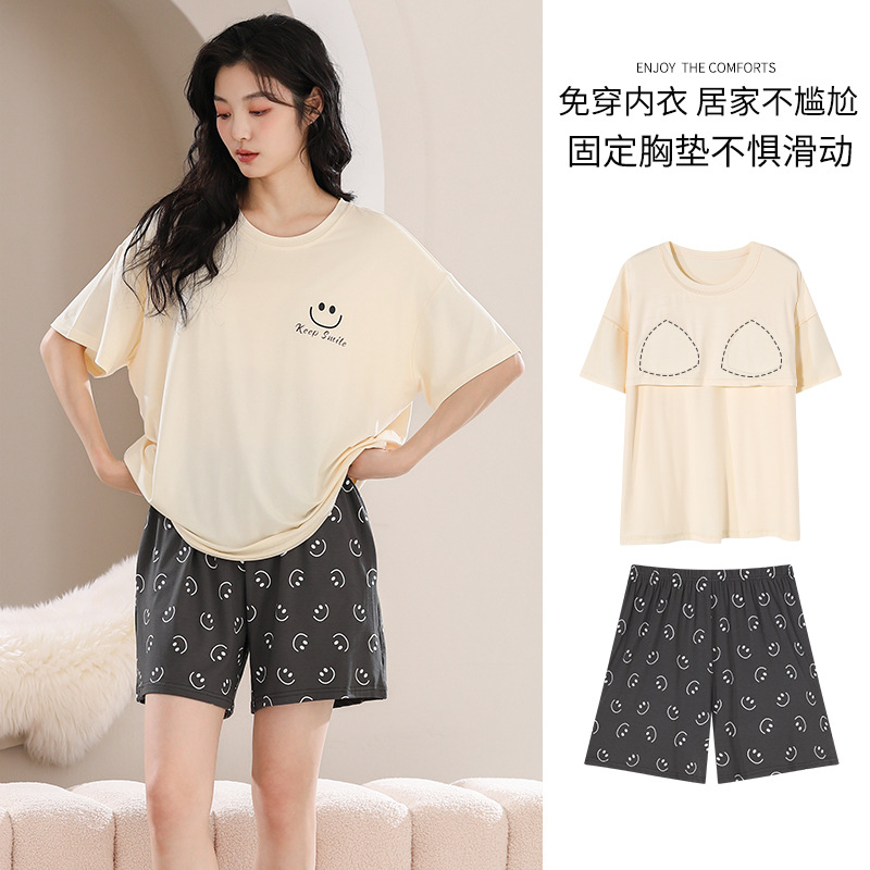 莫代尔睡衣女夏季凉感短袖新款可外穿带胸垫一体家居服夏天