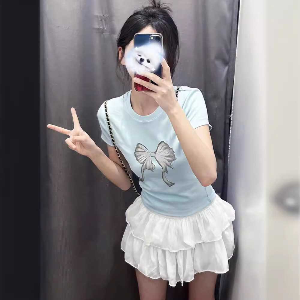 重磅纯棉蓝色修身短款t恤女美式正肩蝴蝶多巴胺纯欲风辣妹上衣夏