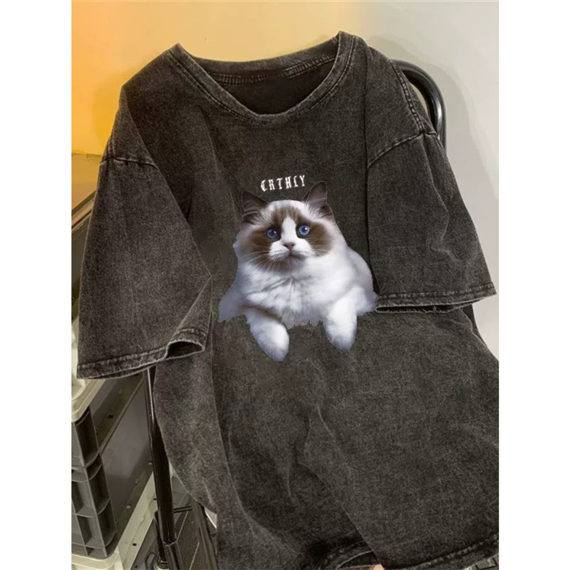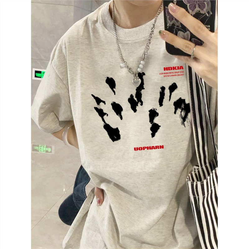夏ins宽松大码200斤水洗做旧短袖t恤女印花纯棉半袖情侣上衣