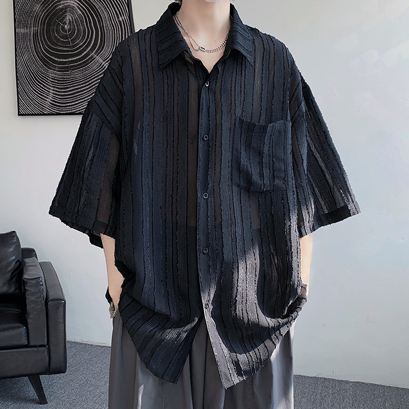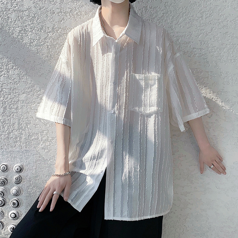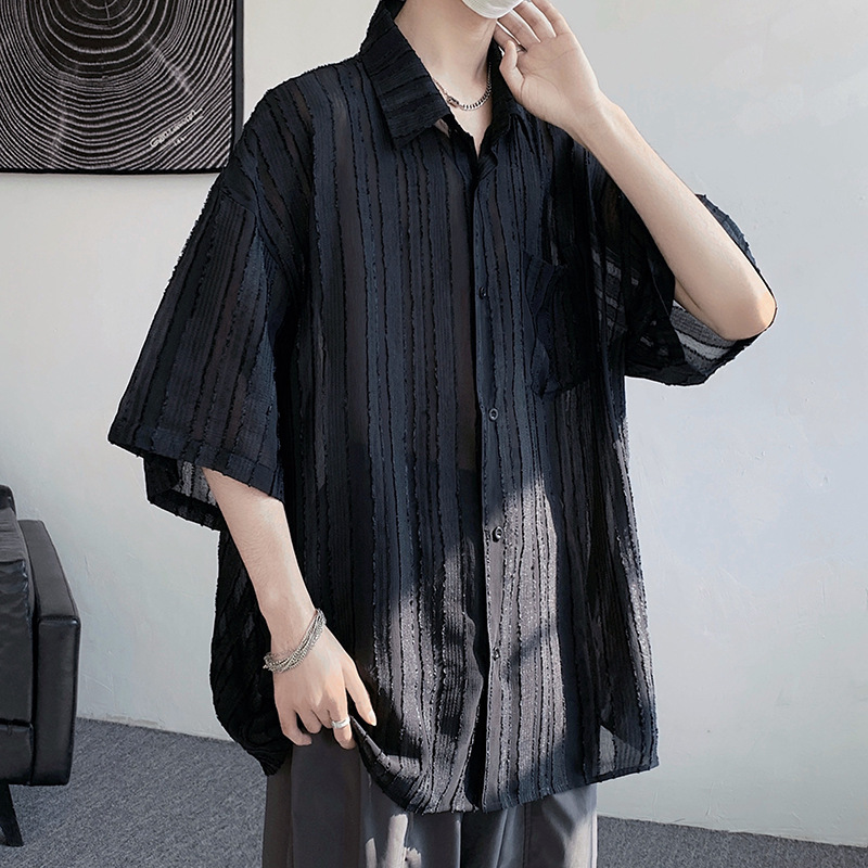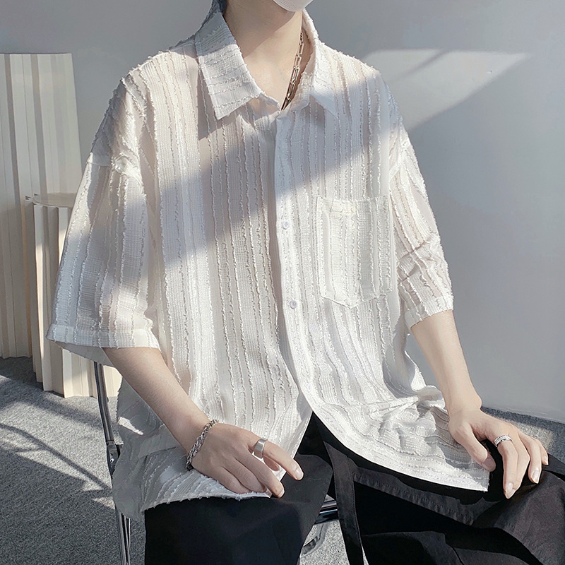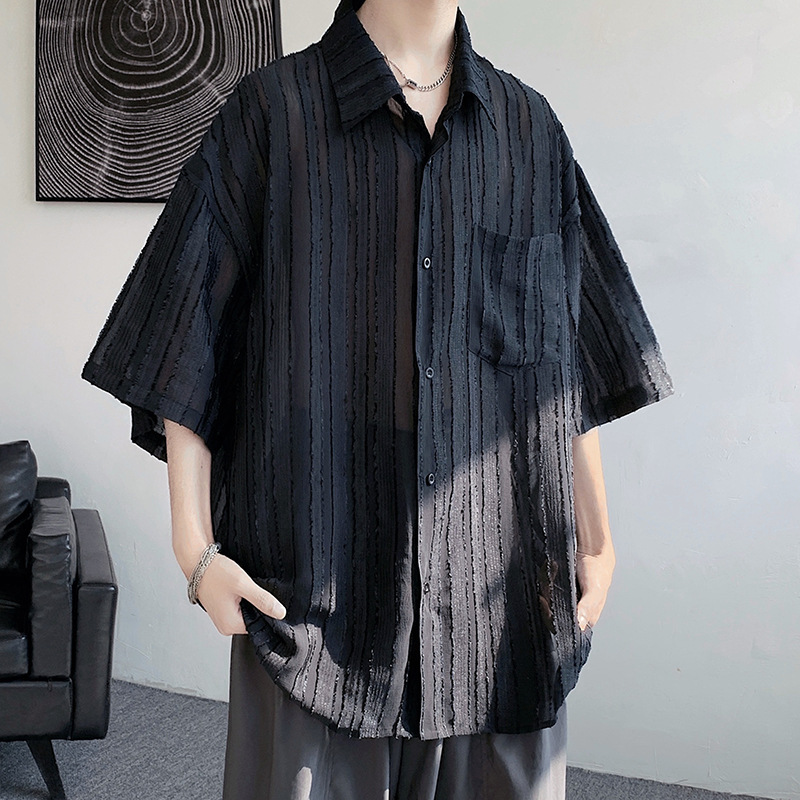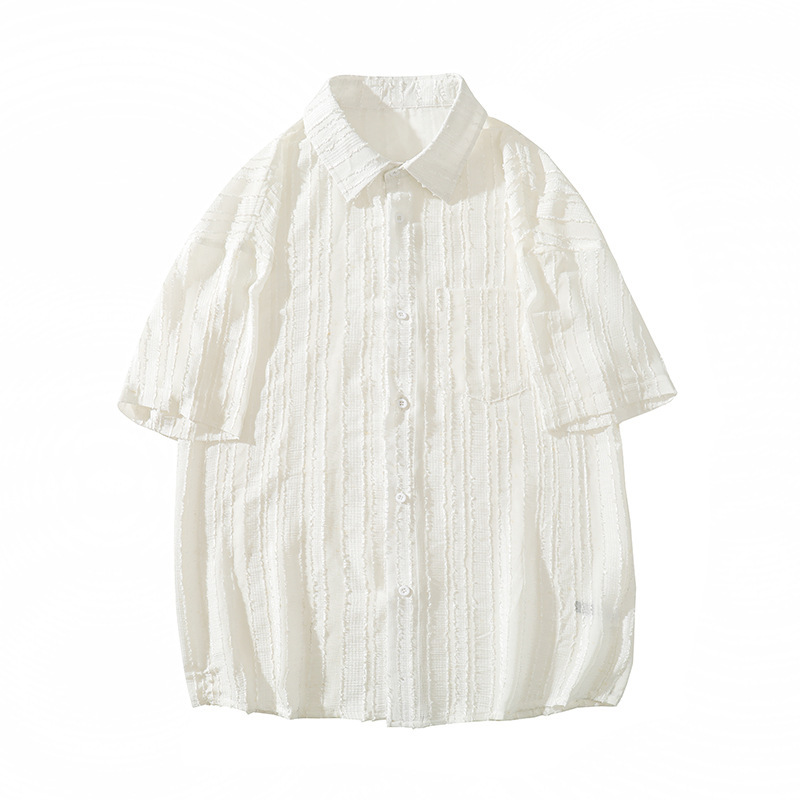禁欲系冰丝衬衫男士短袖夏季宽松休闲薄款凉感设计感小众衬衣外套