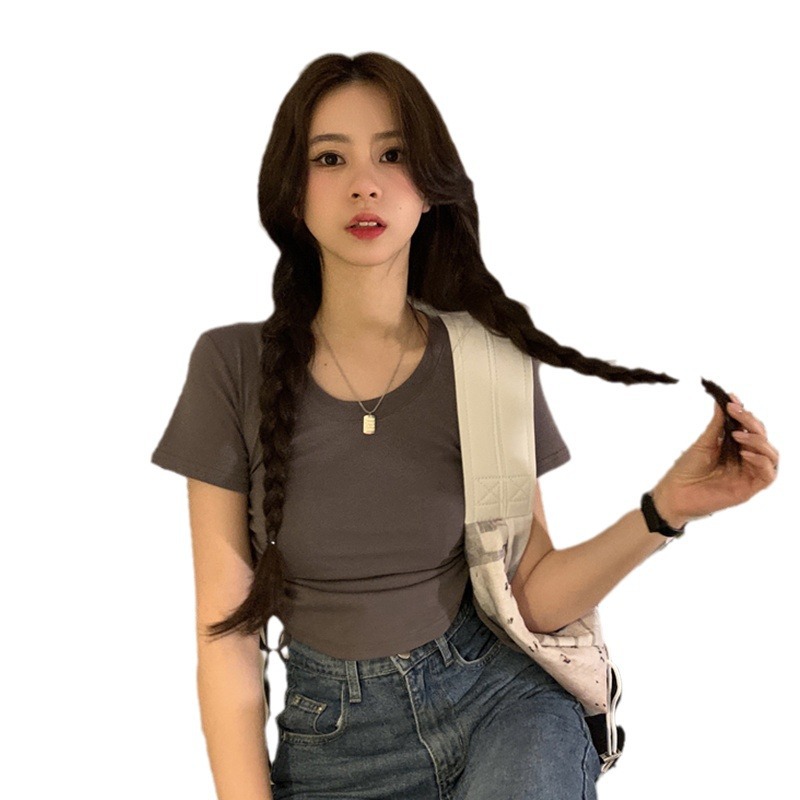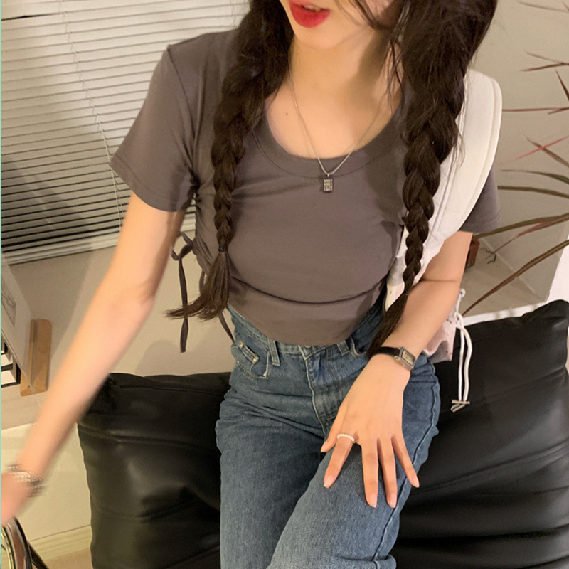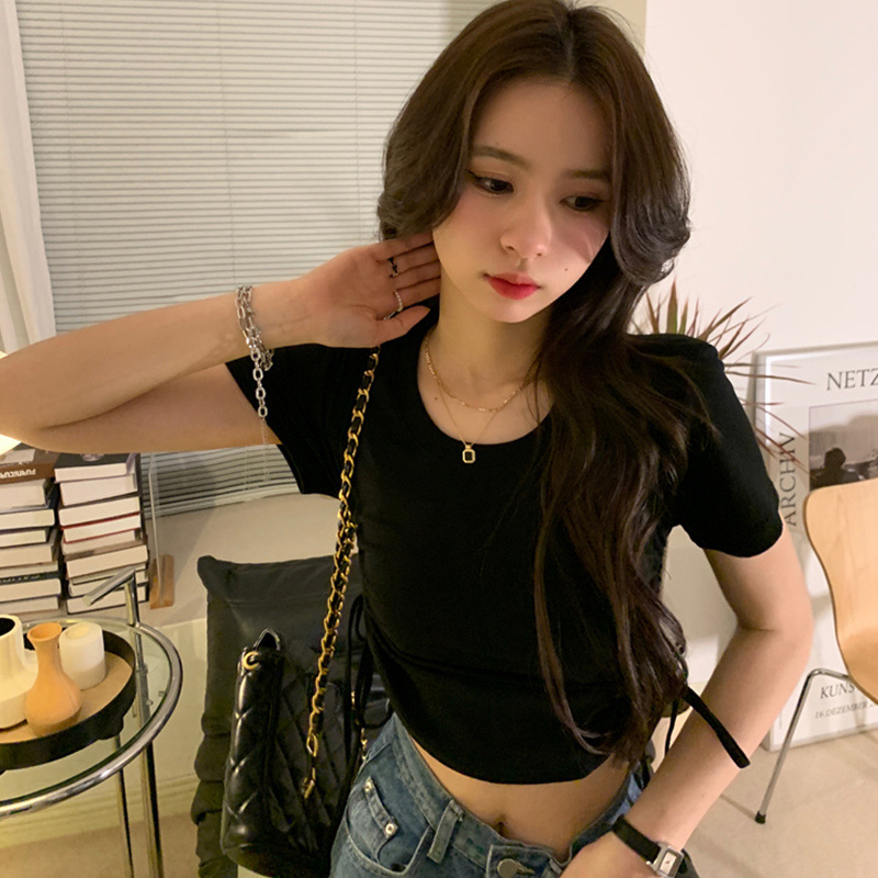 夏季新款白色圆领短袖T恤女设计感小众修身显瘦短款抽绳上衣