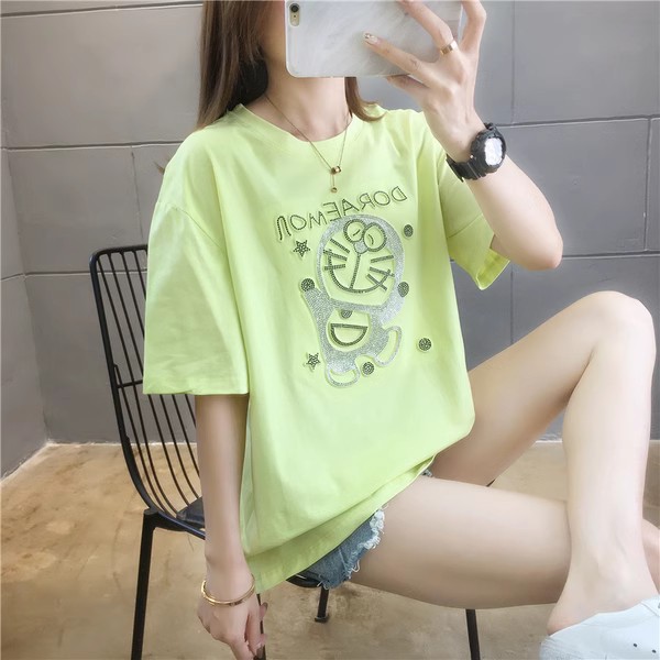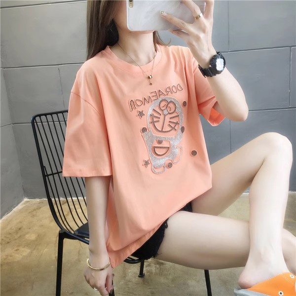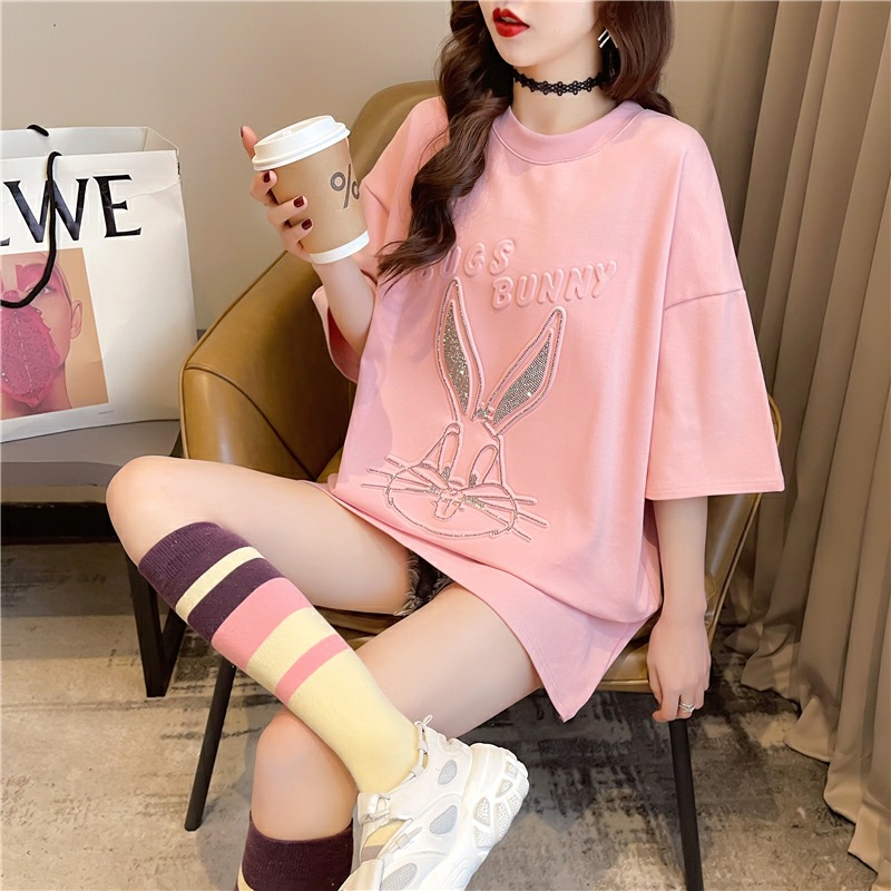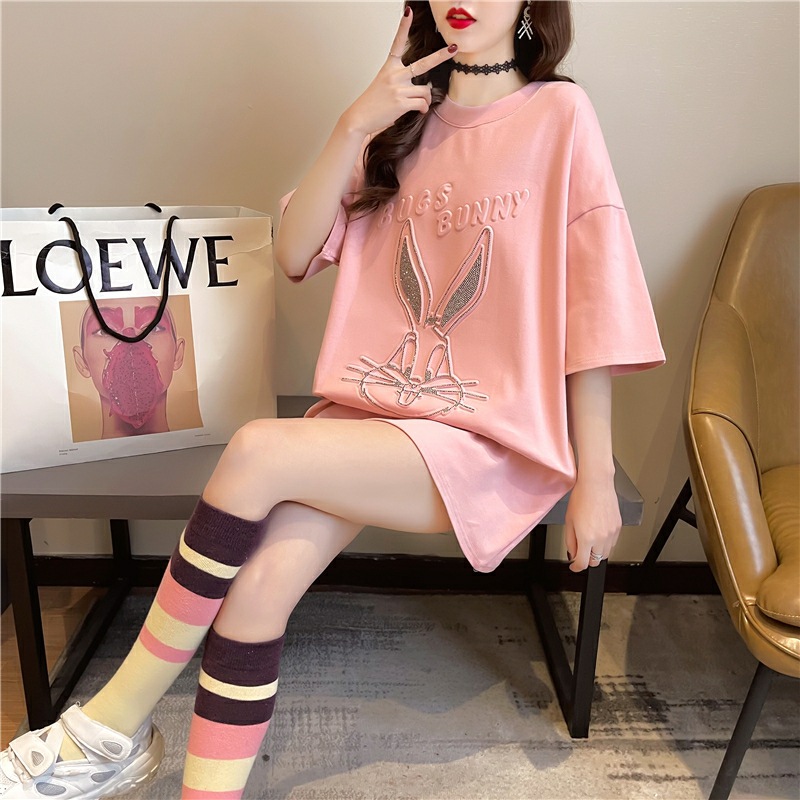 重工烫钻中长款欧货夏季新款宽松韩版短袖t恤大码女装学生