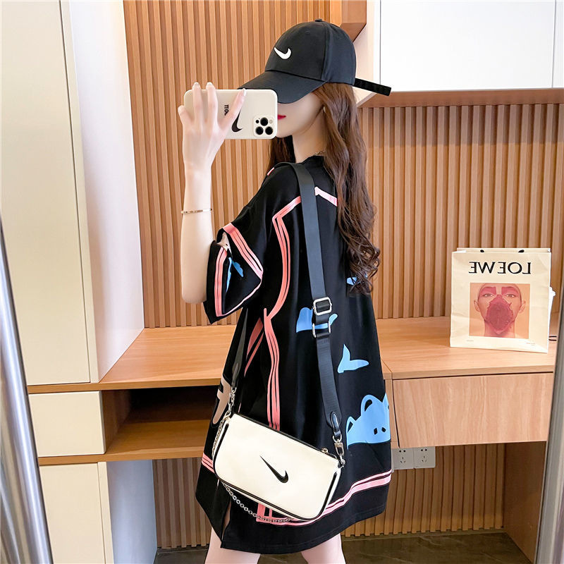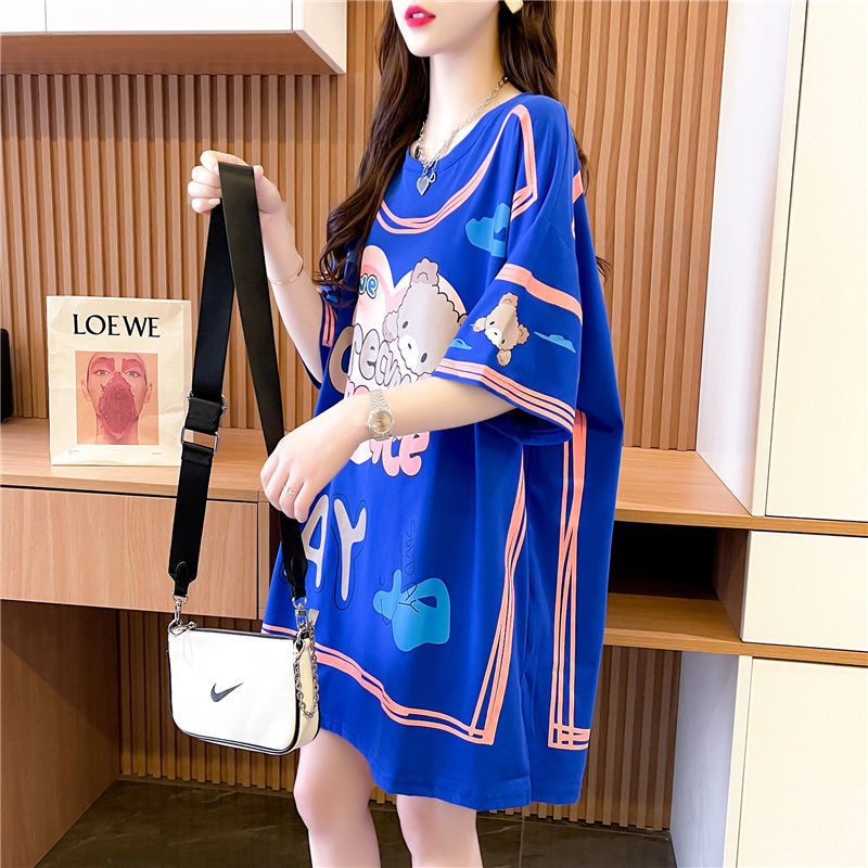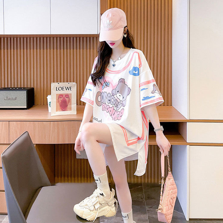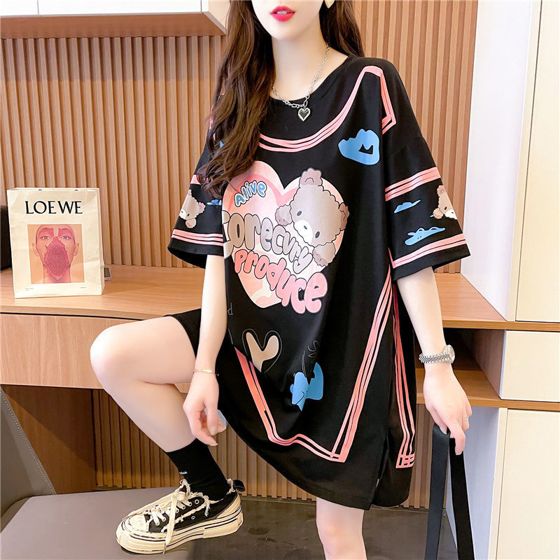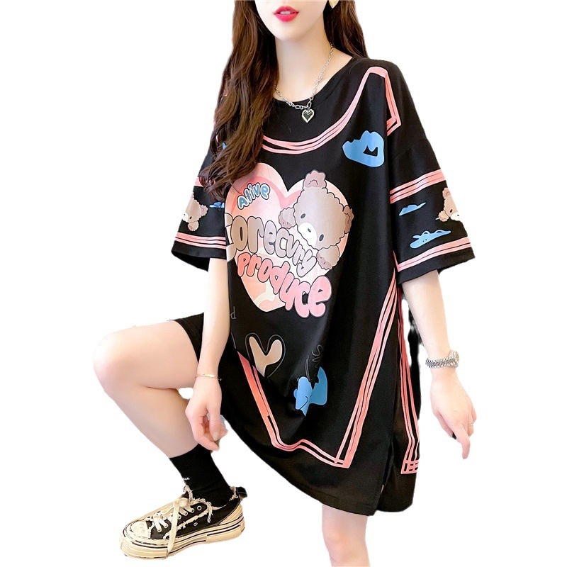 中长款小熊印染设计感下摆开叉短袖T恤女时髦洋气失踪