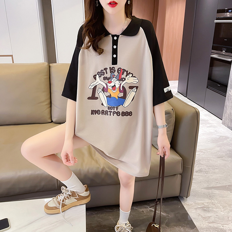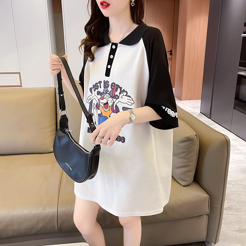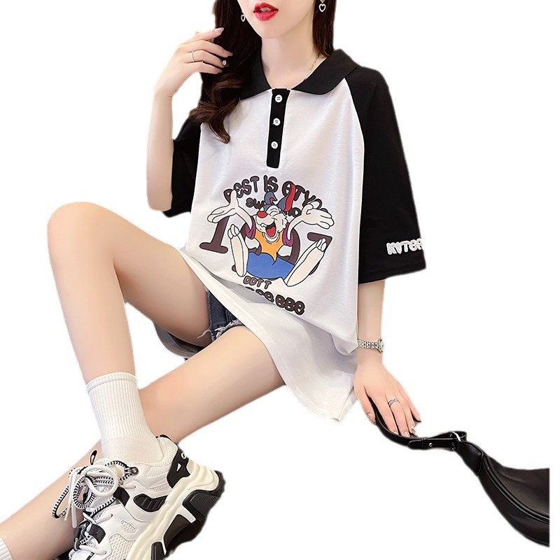 卡通中长款POLO领拼色短袖t恤女减龄夏季新款洋气时髦上衣