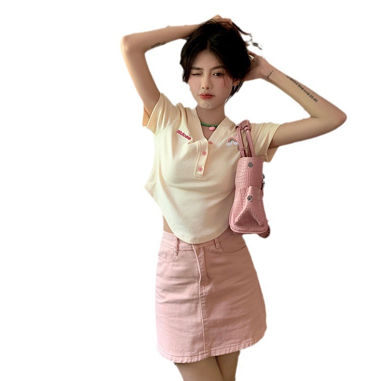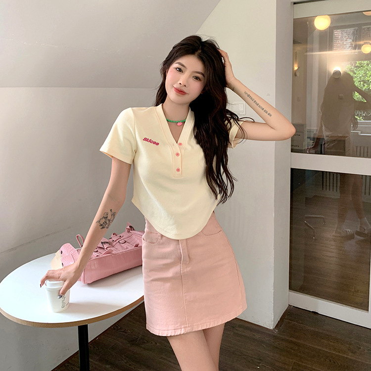 纯棉修身V领刺绣短袖t恤女夏季新款别致小众设计感时髦洋气上衣潮