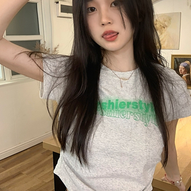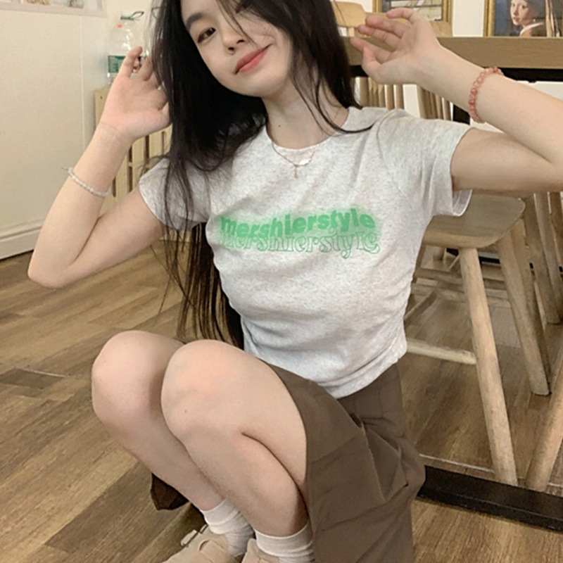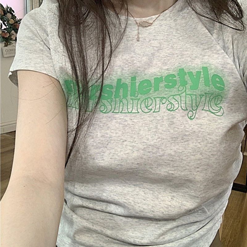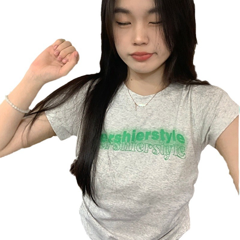 纯棉美式辣妹灰色短款T恤女抽褶高腰短袖上衣夏季新款字母