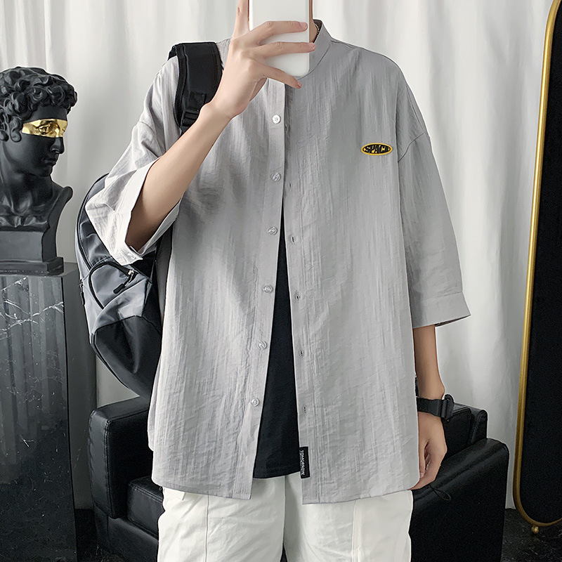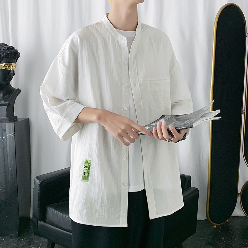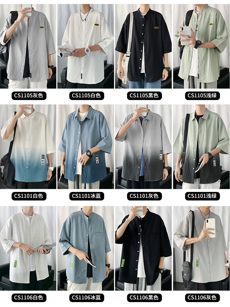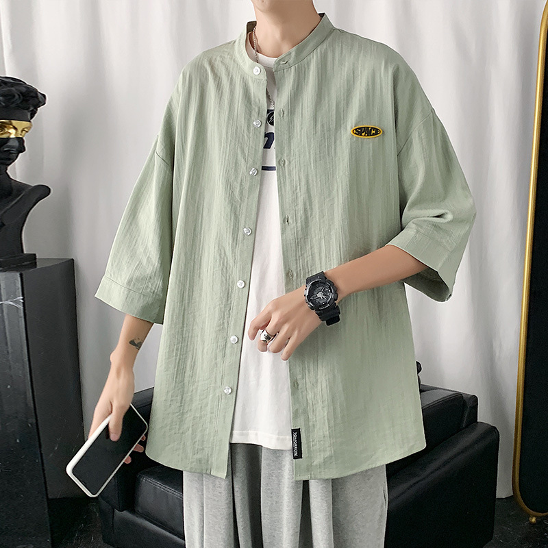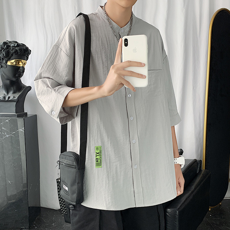 冰丝衬衫男士七分短袖亚麻衬衣夏季设计感港风日系潮休闲衬衫外套