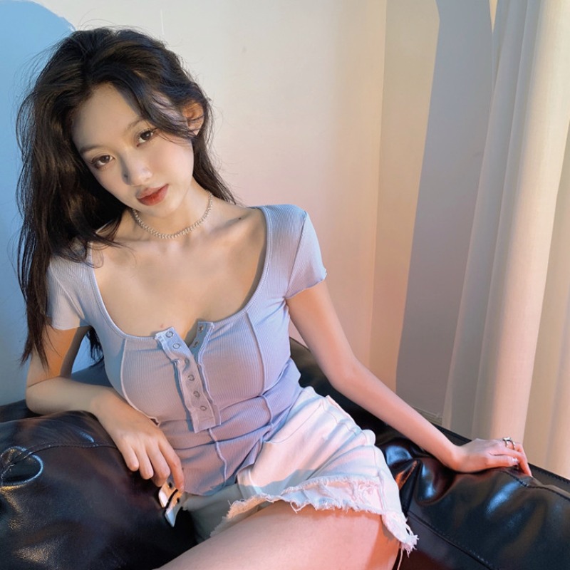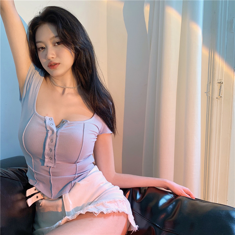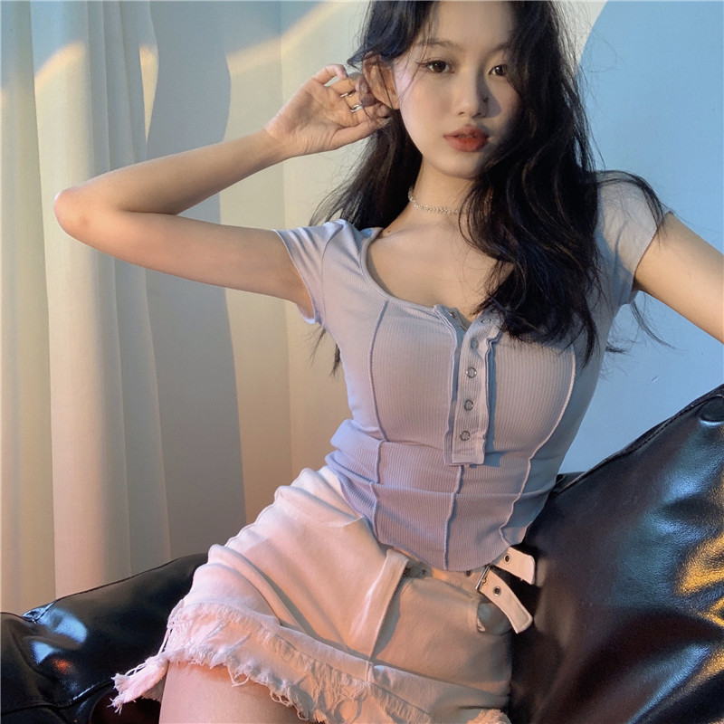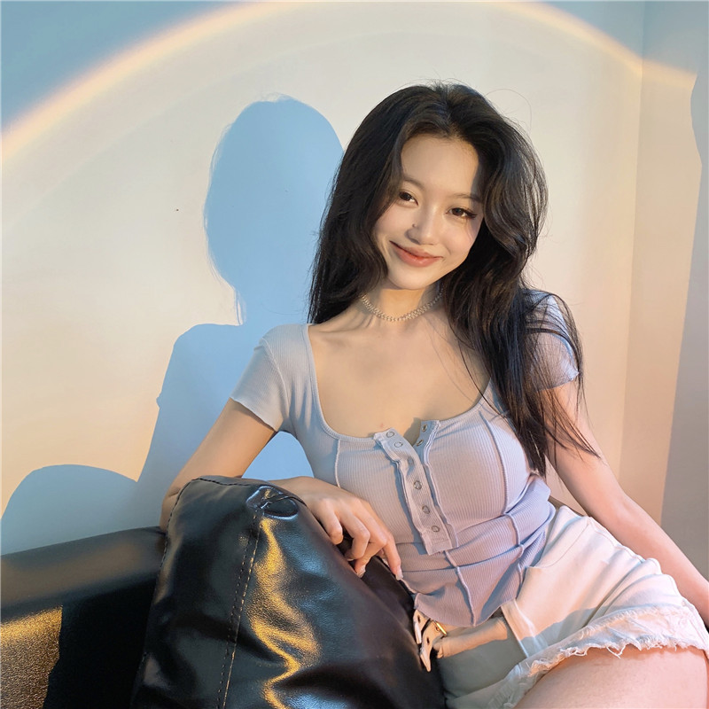 罗纹纯欲设计感U领T恤女夏季新款修身短款上衣