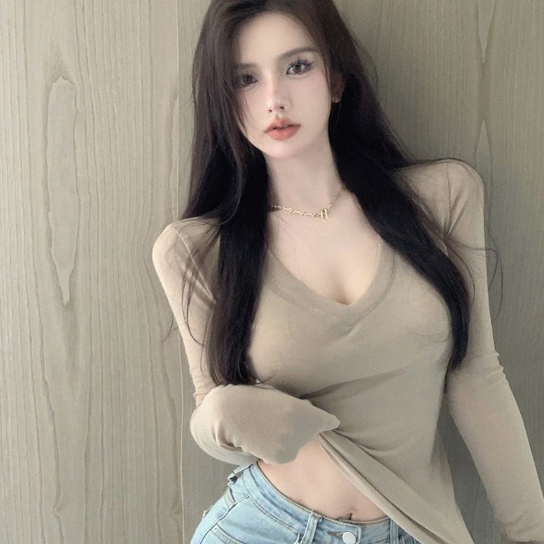 白色辣妹T恤女秋冬V领性感紧身内搭打底衫修身显瘦长袖短款上衣