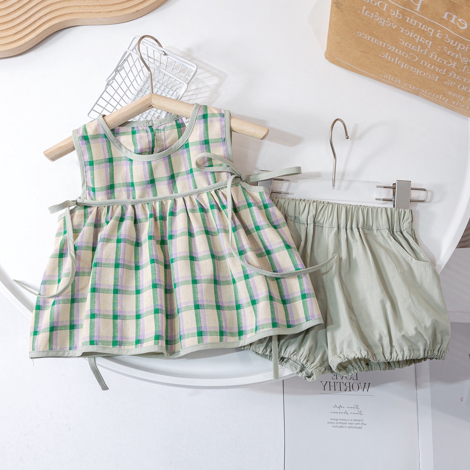 夏季女童套装宝宝洋气儿童个性潮韩版清新格子背心娃娃衫花苞短裤