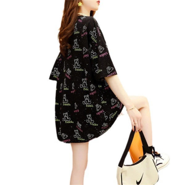满印小熊短袖棉t恤洋气减龄女中长款大码胖mm宽松遮肚上衣藏肉
