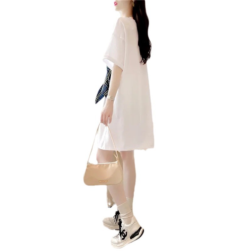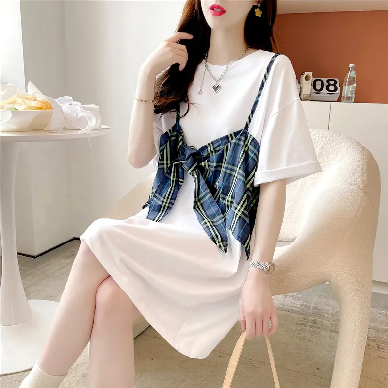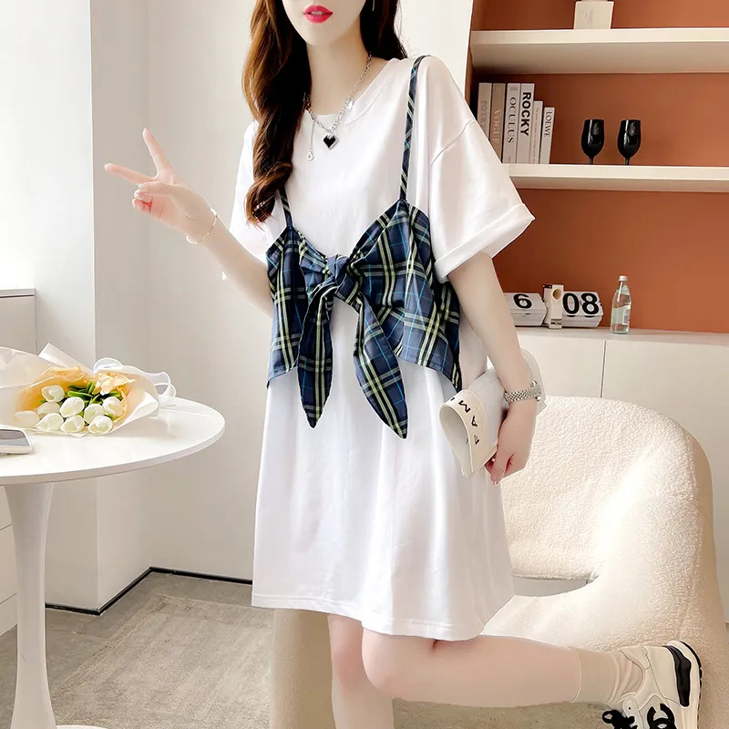 t恤显瘦拼接假两件黑色连衣裙宽松夏减龄新款大码女装洋气时髦潮