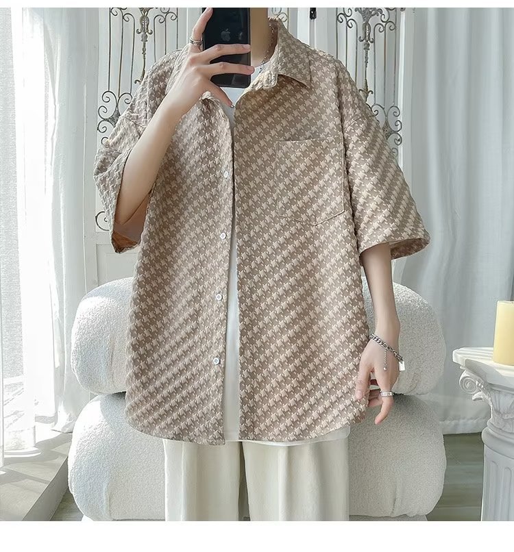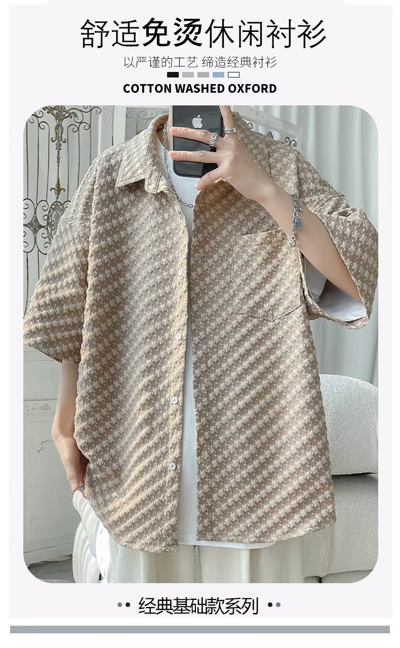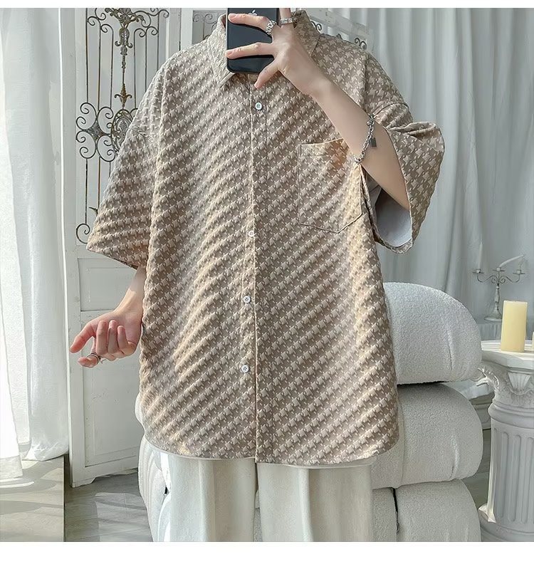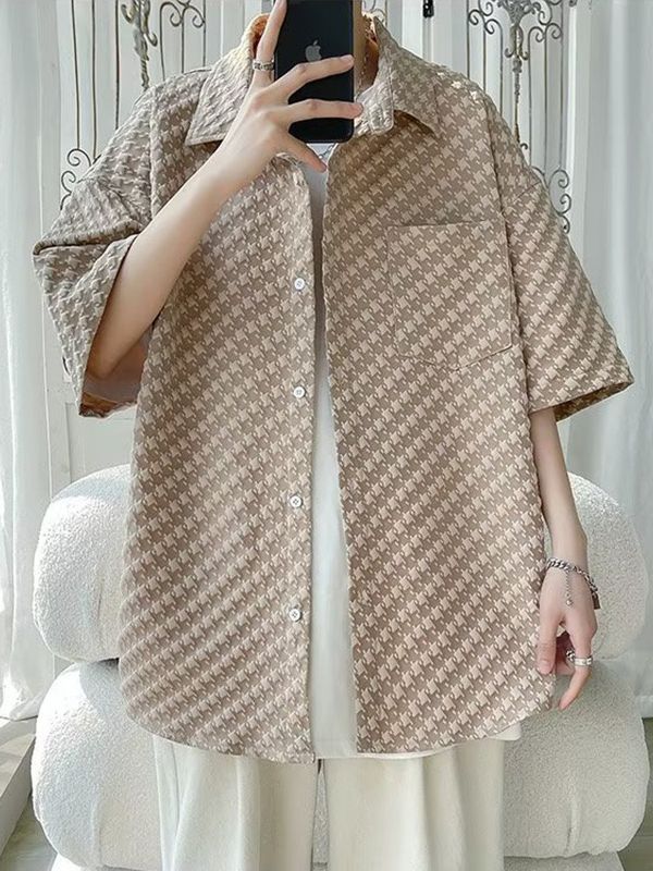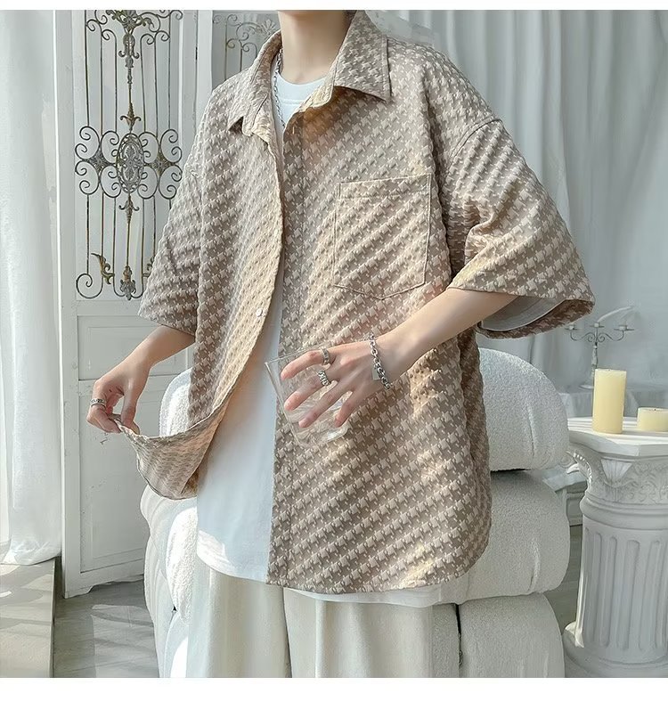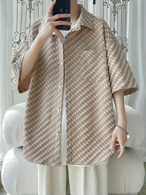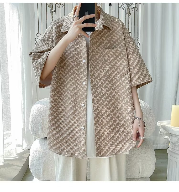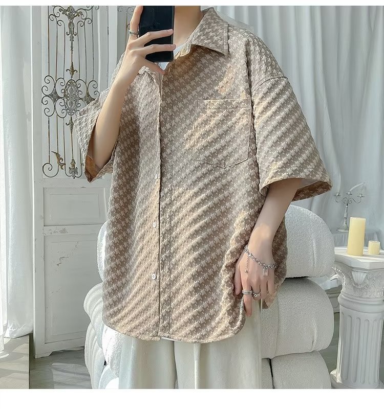 千鸟格短袖衬衫男士夏季冰丝痞帅外套翻领男生设计感潮牌半袖衬衣
