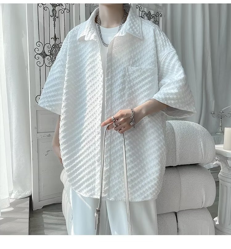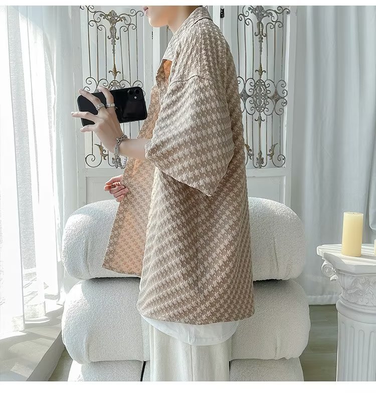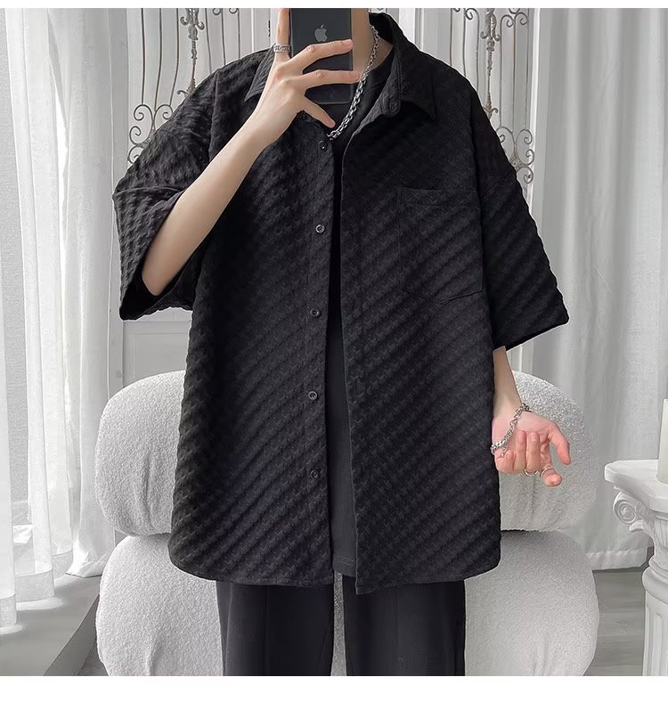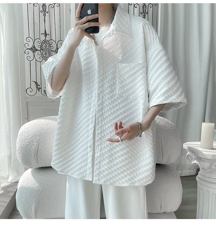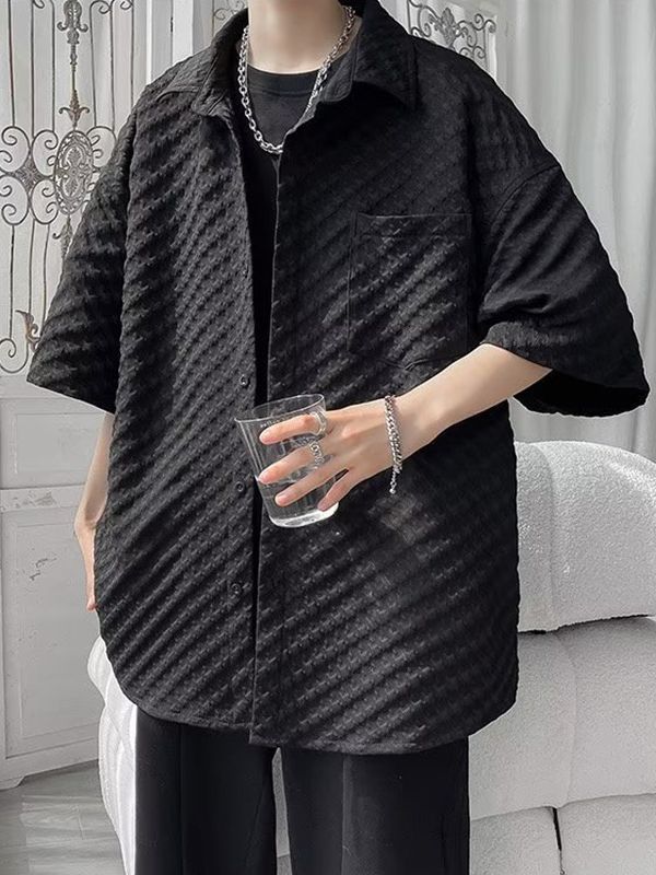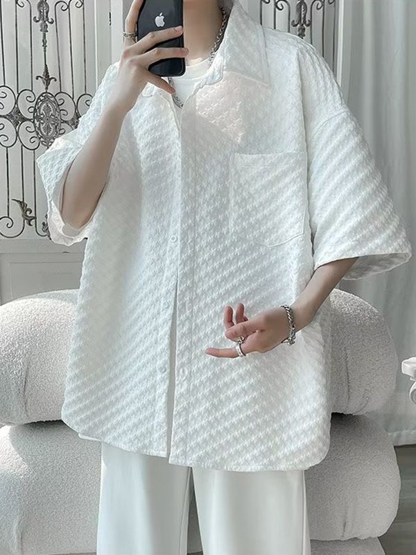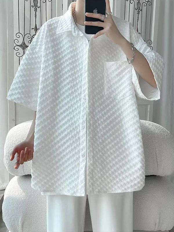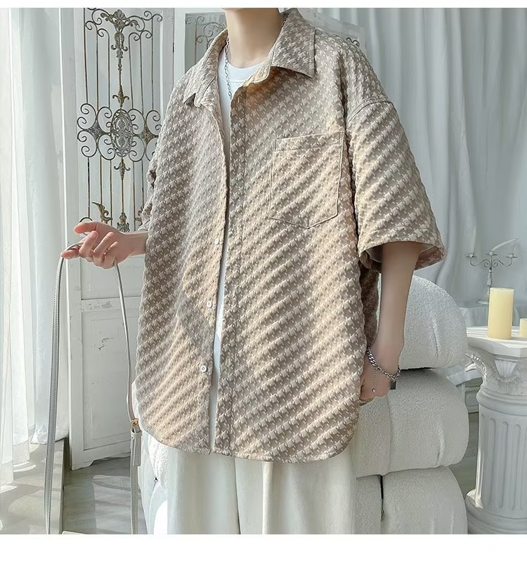 千鸟格短袖衬衫男士夏季冰丝痞帅外套翻领男生设计感潮牌半袖衬衣
