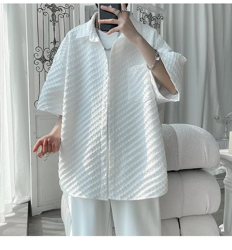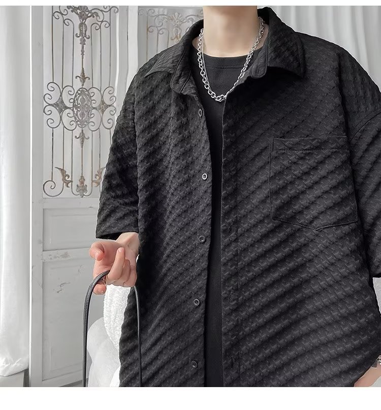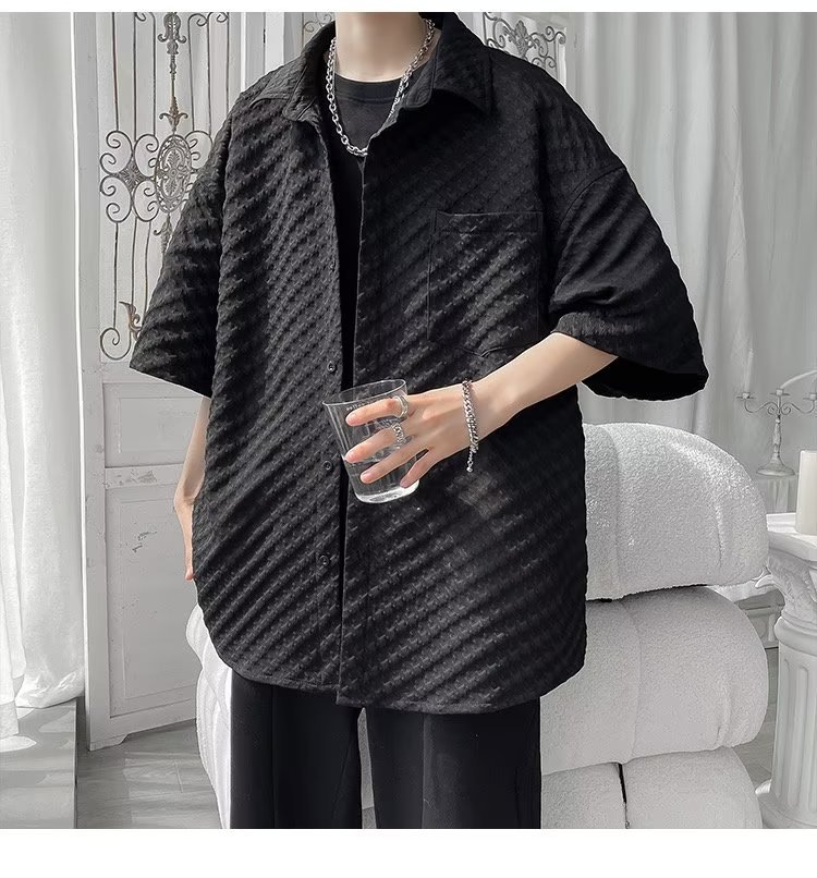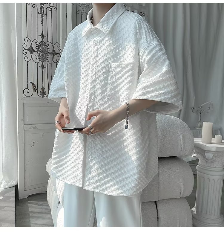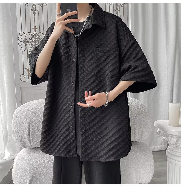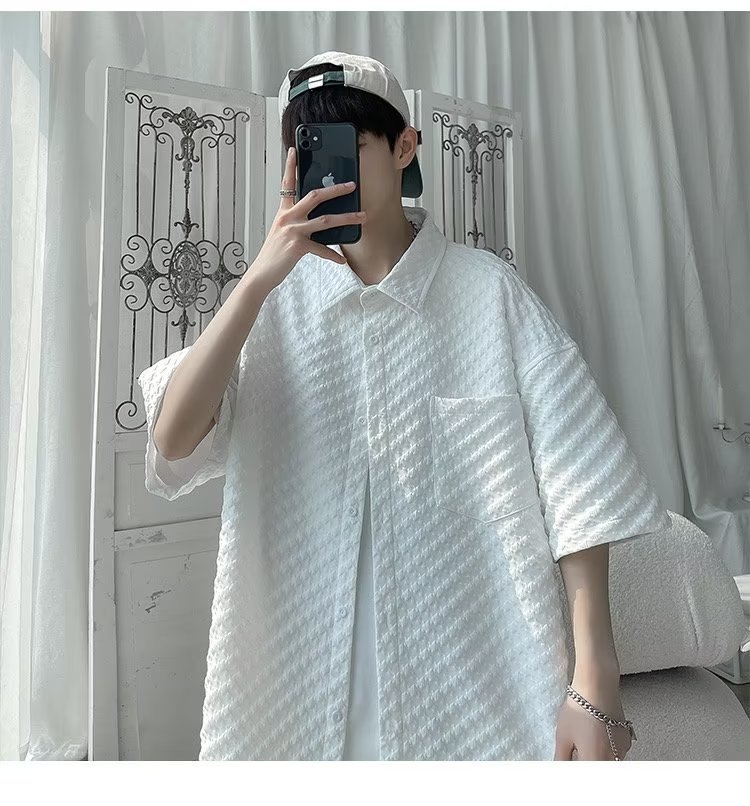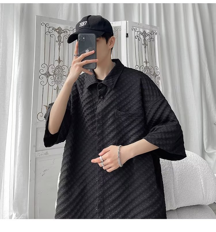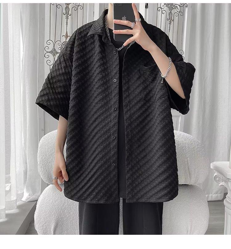 千鸟格短袖衬衫男士夏季冰丝痞帅外套翻领男生设计感潮牌半袖衬衣