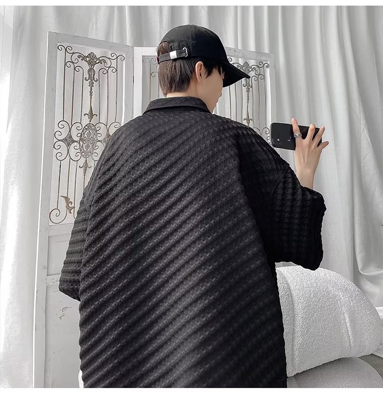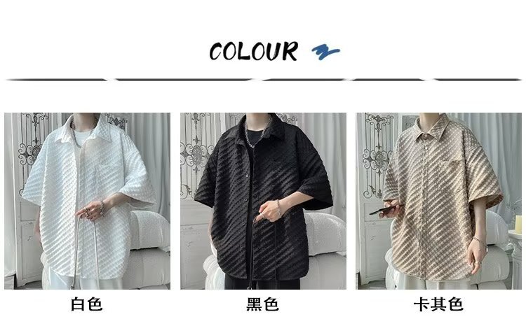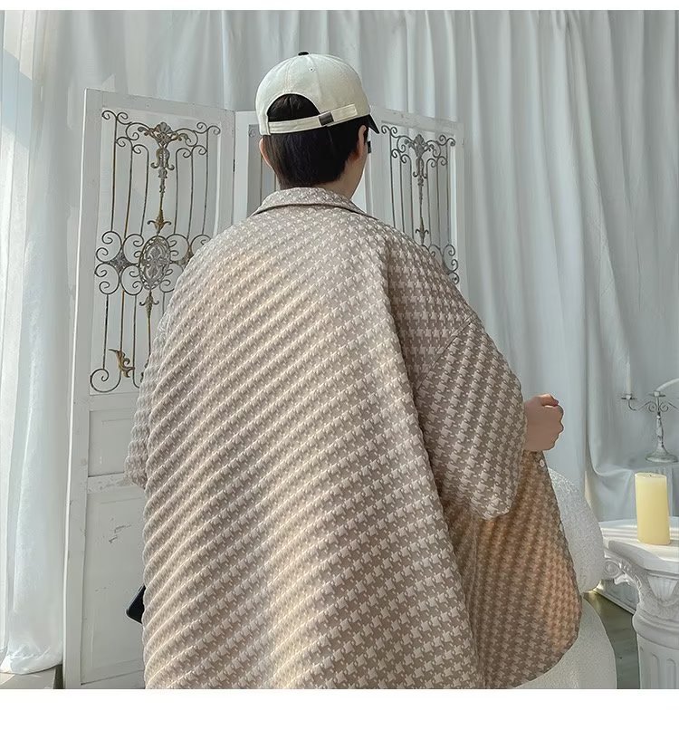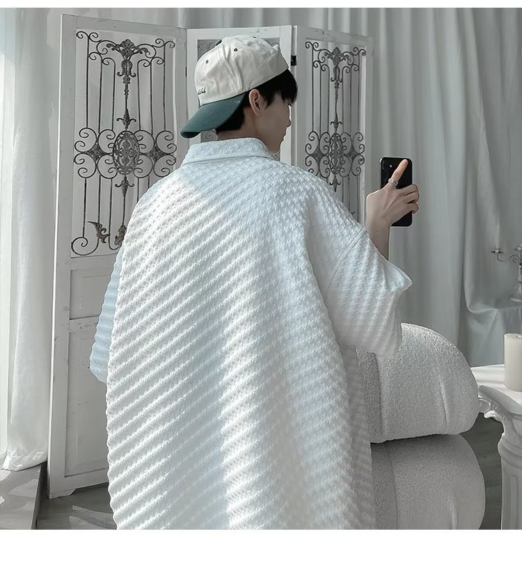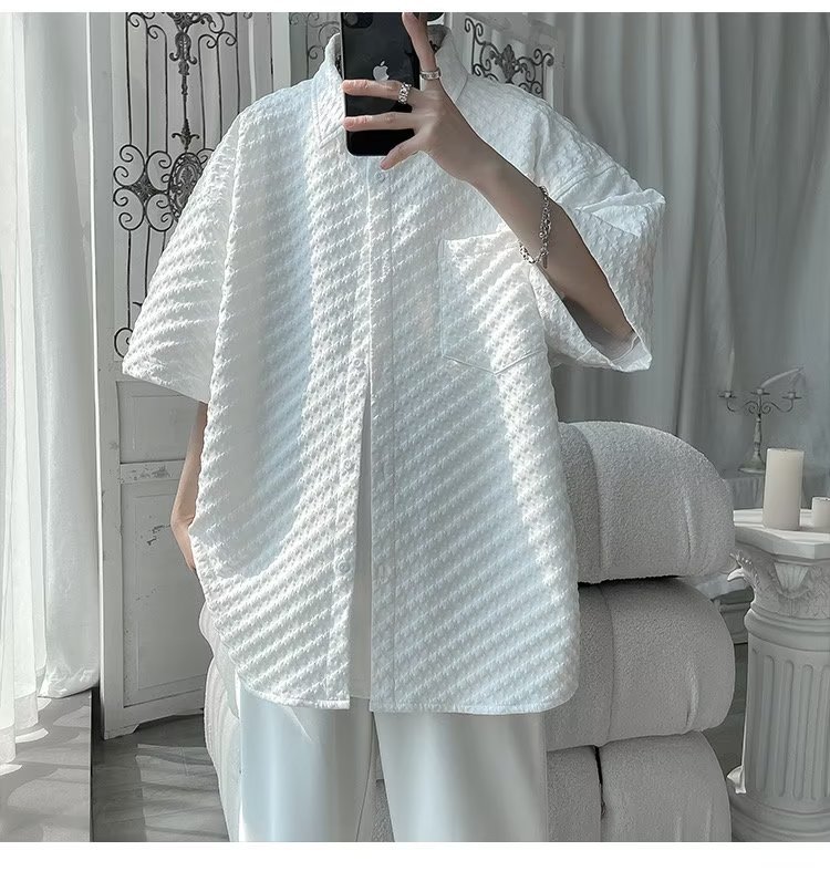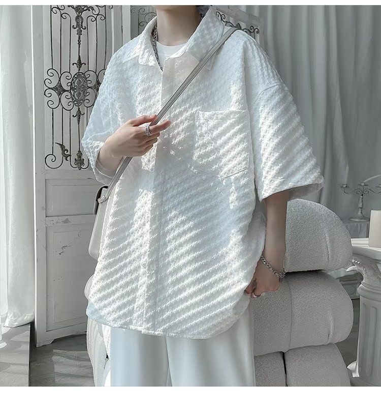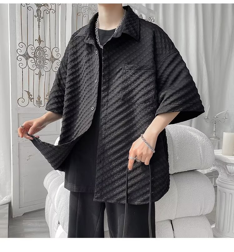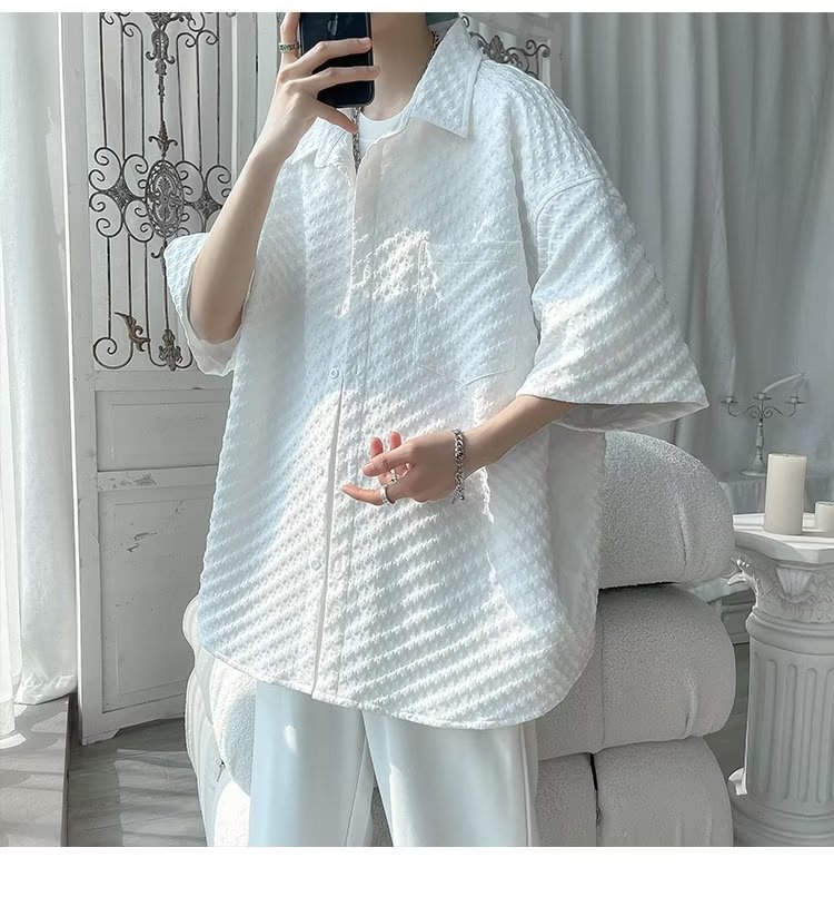 千鸟格短袖衬衫男士夏季冰丝痞帅外套翻领男生设计感潮牌半袖衬衣