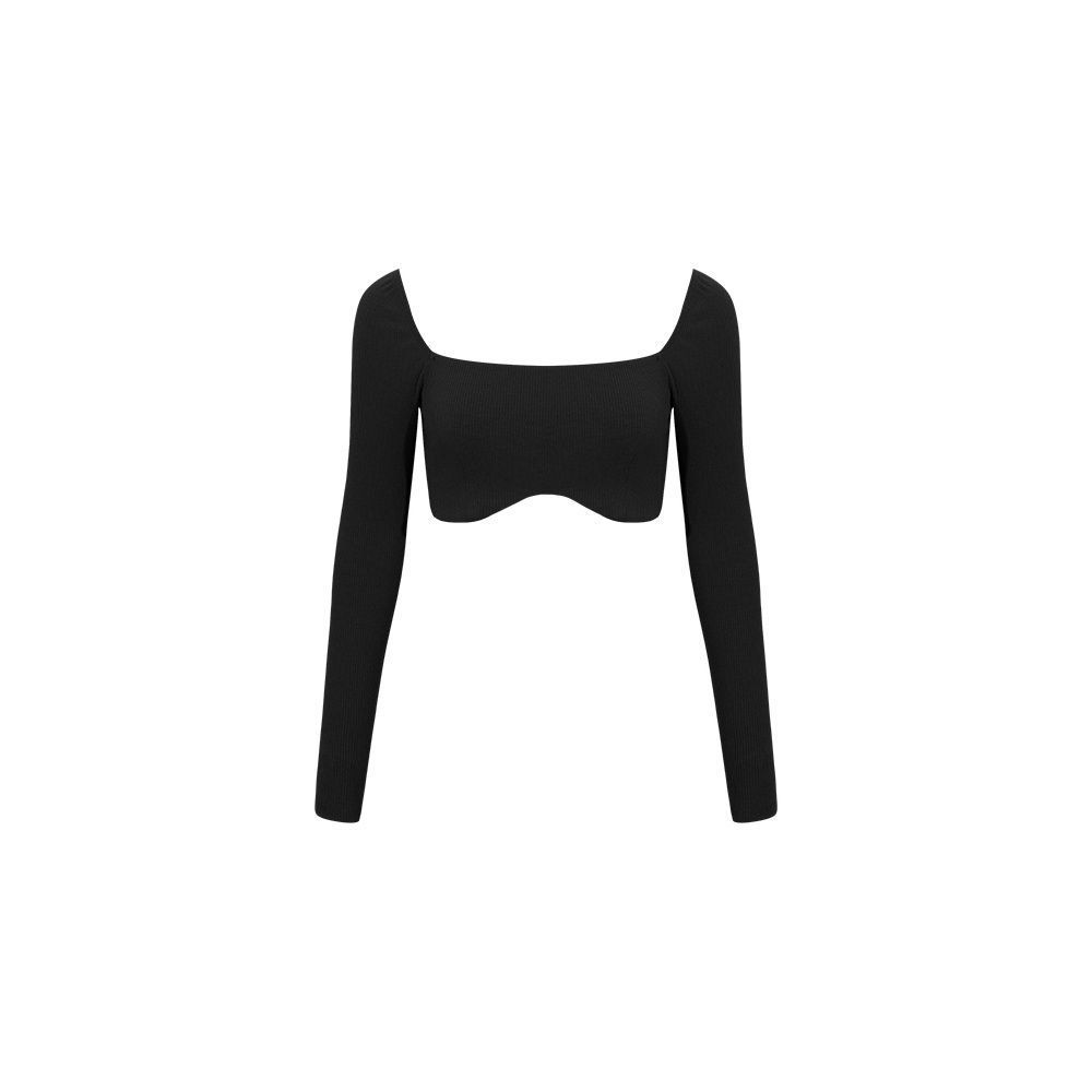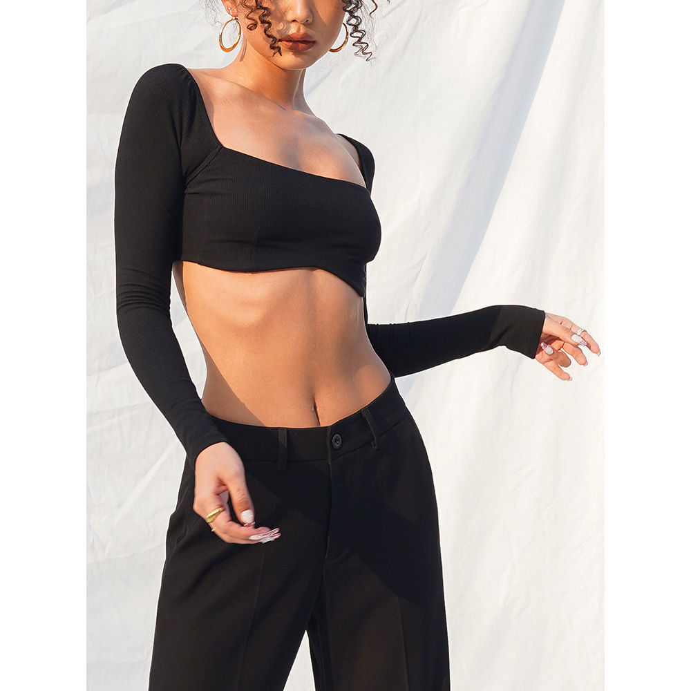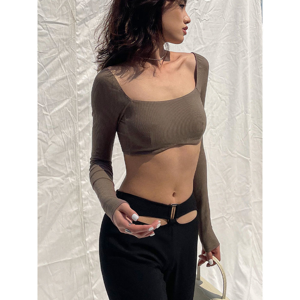 性感外贸前后双层露脐高腰U领短款长袖T恤上衣打底欧美街头小众潮