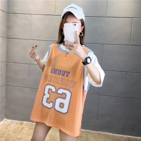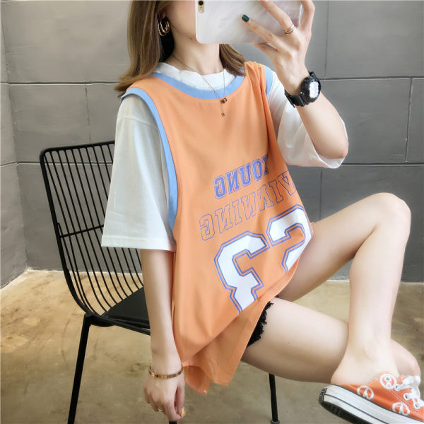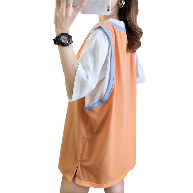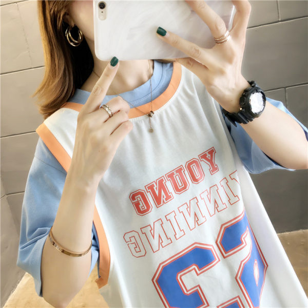 夏季女装新款中长款假两件短袖t恤女宽松显瘦百搭球服上衣潮