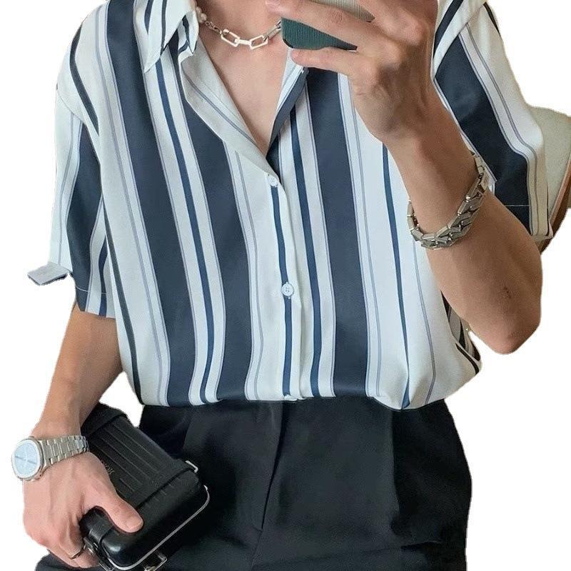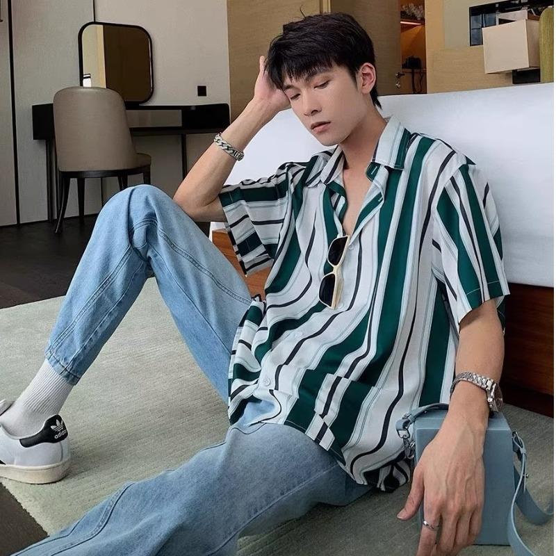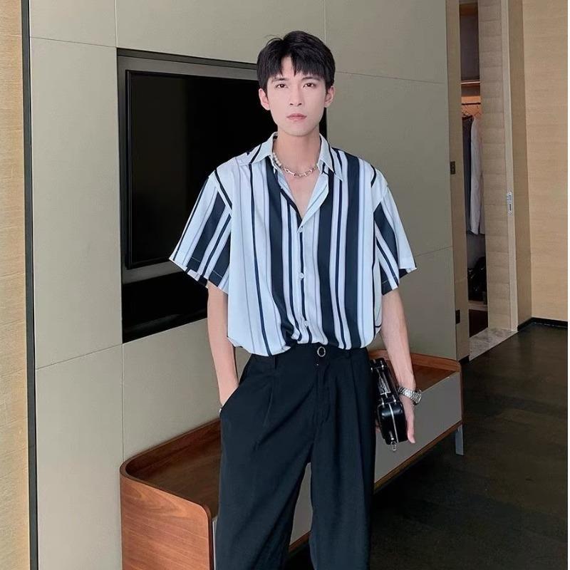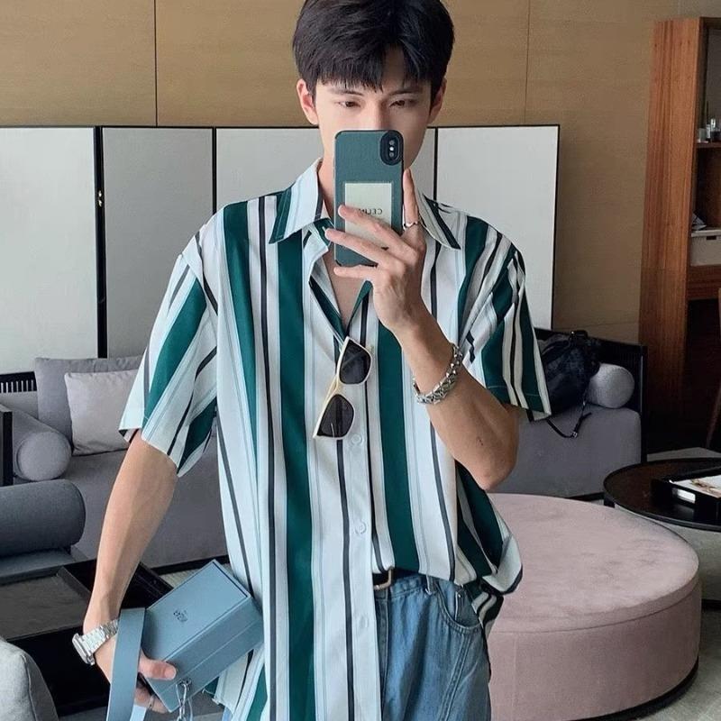 免烫条纹短袖衬衫夏季薄款冰丝男INS潮流设计感小众半袖痞帅衬衣