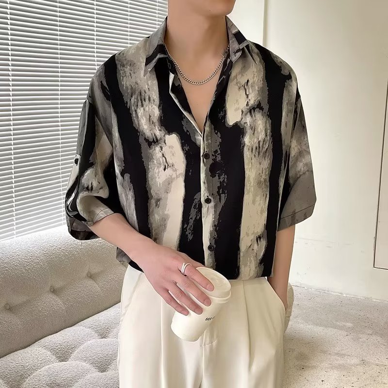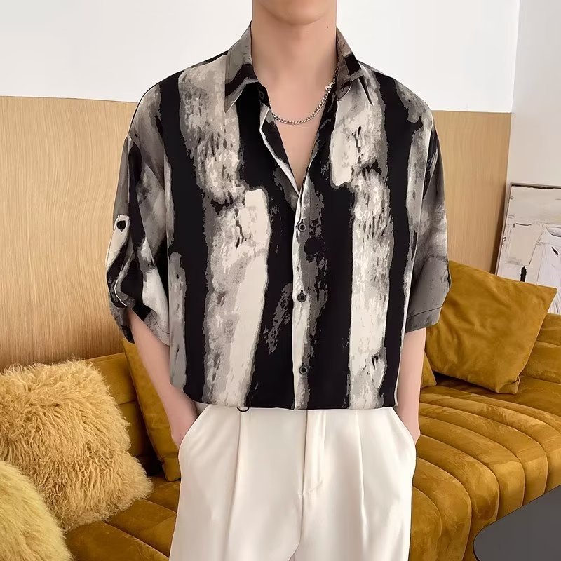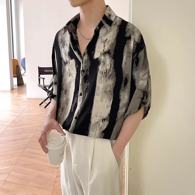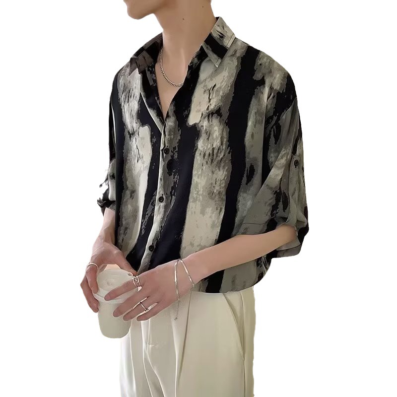 夏季薄款冰丝七分袖衬衣男士潮牌设计感宽松短袖衬衫潮流气质男装