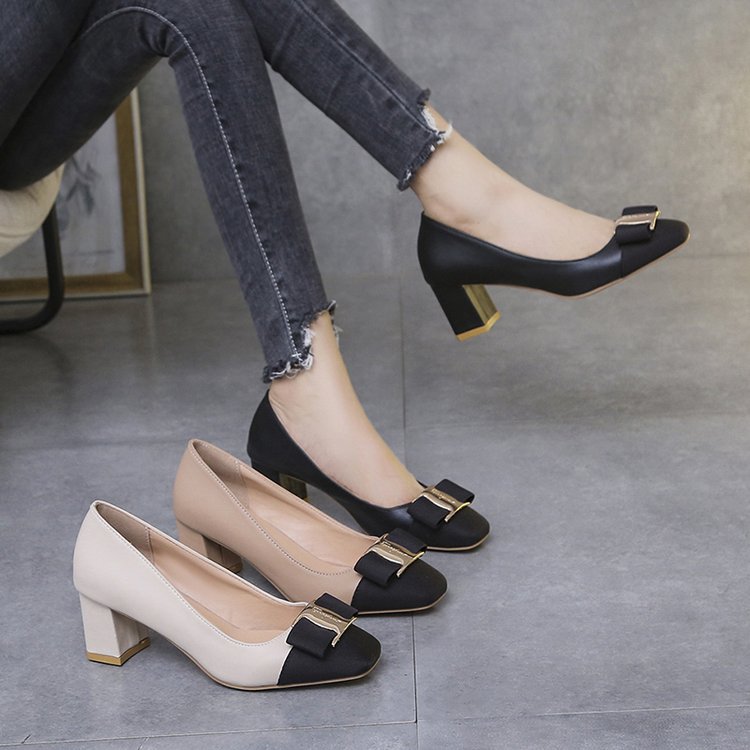 高跟鞋女新款女鞋秋韩版方头浅口单鞋女式粗跟蝴蝶结时装鞋女