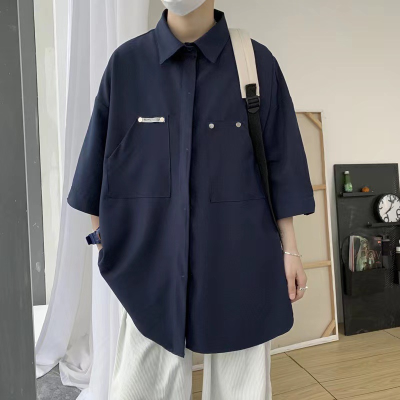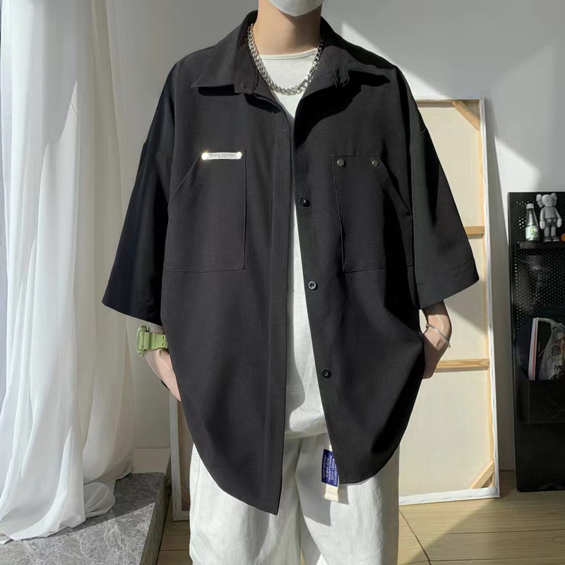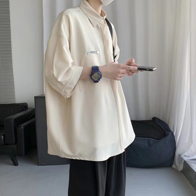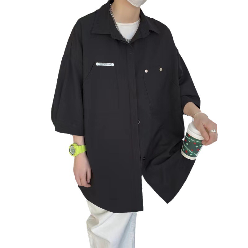 灵悦 日系冰丝短袖衬衫男小众高级设计感潮流宽松百搭七分袖衬衣