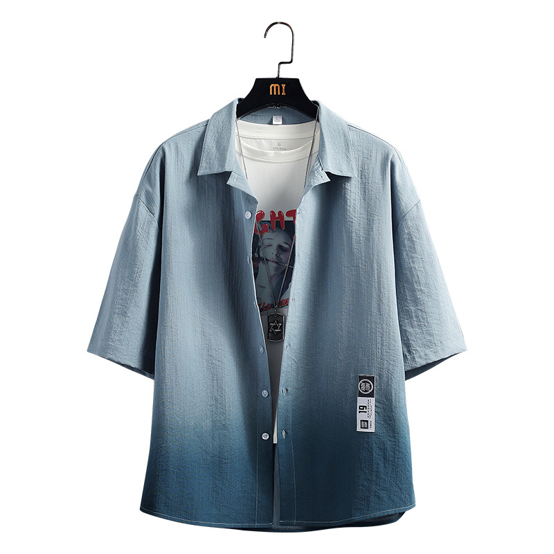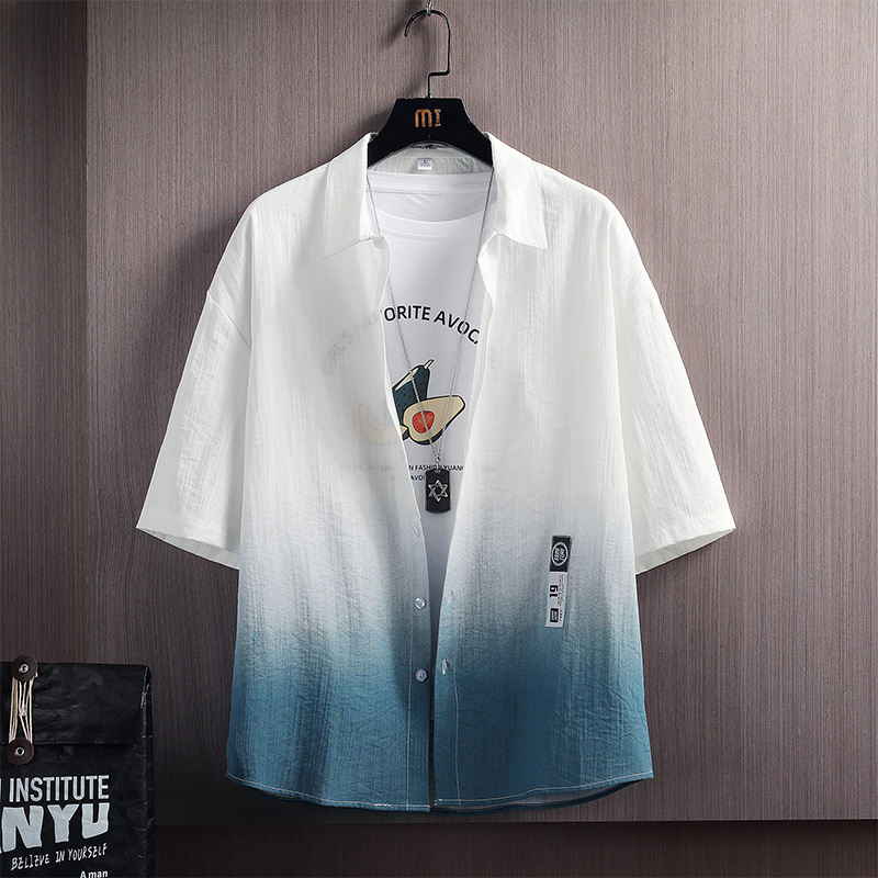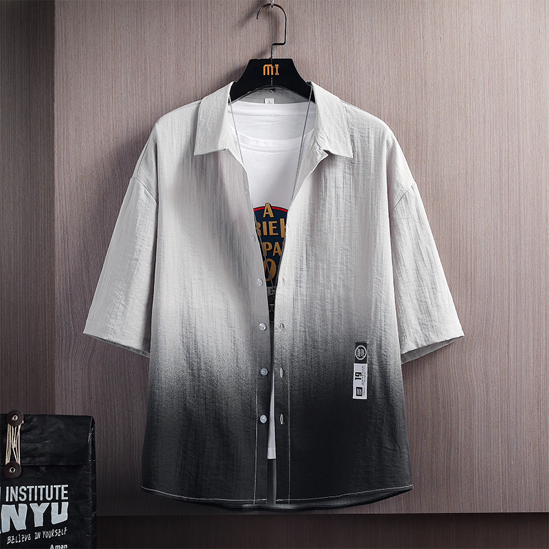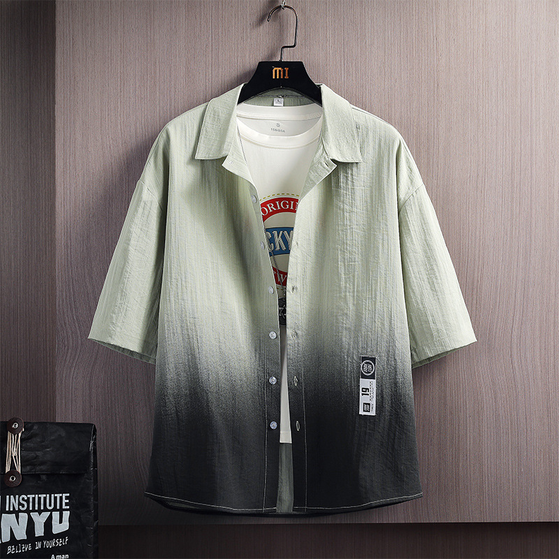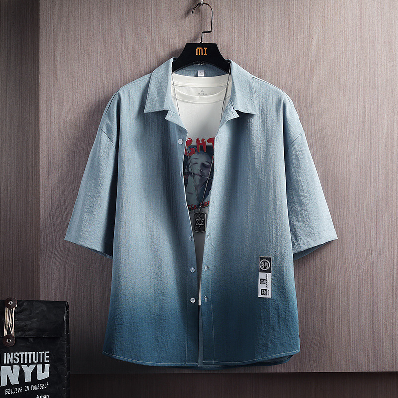 冰丝衬衫男渐变七分短袖亚麻衬衣夏季设计感港风日系潮休闲衬衫