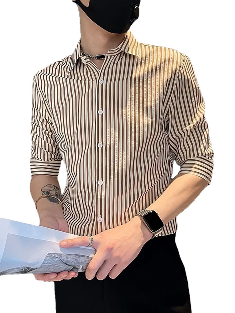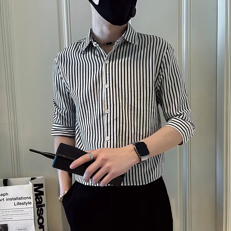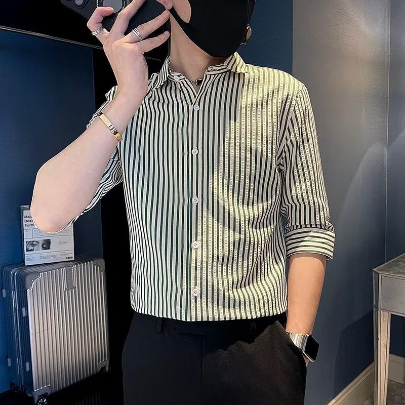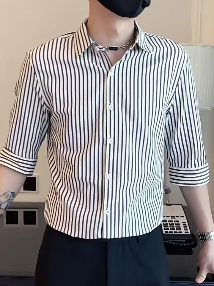 条纹七分袖衬衫男 设计感痞帅潮牌短袖寸衫休闲夏季冰丝7分袖衬衣