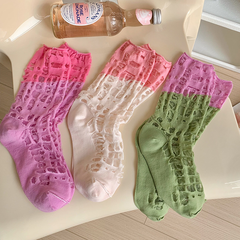 撞色拼接破洞乞丐镂空网眼袜子女夏季透气玻璃丝中筒袜薄款堆堆袜