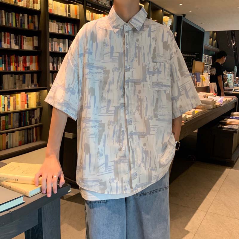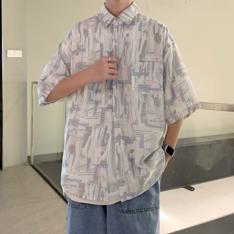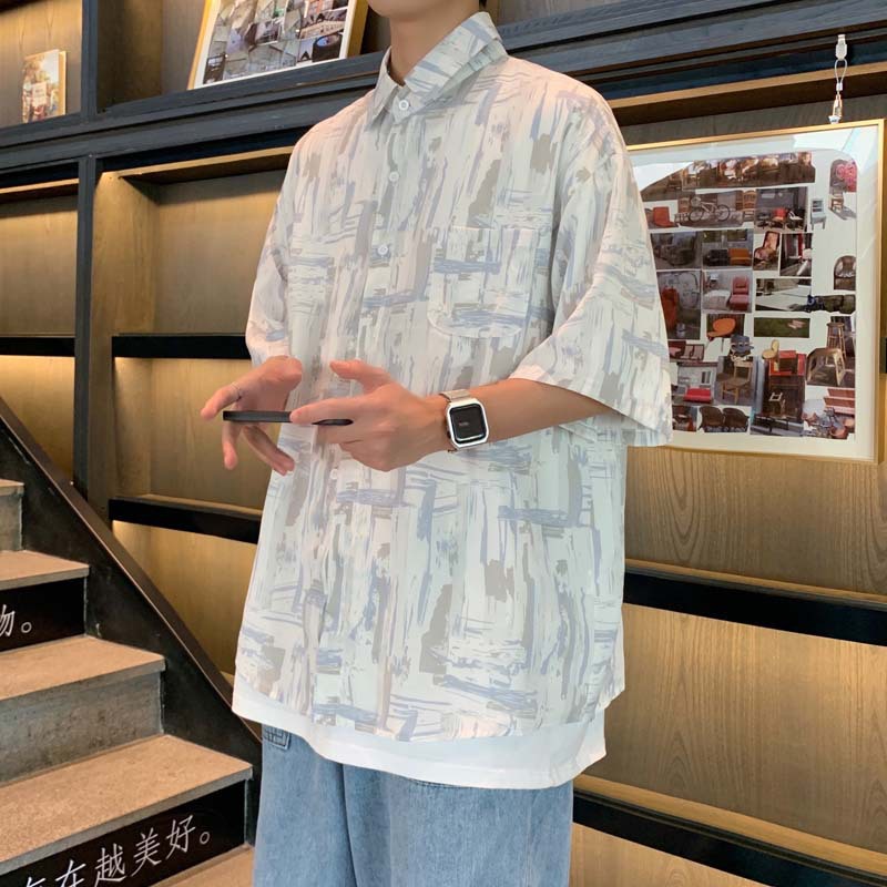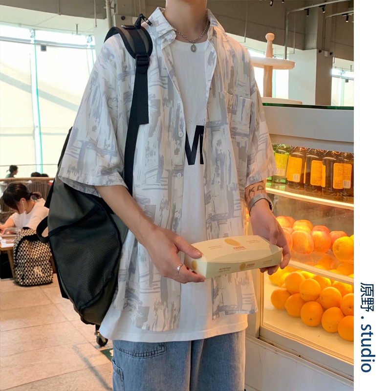 冰丝衬衫男设计感小众夏季ins港风情侣原宿五分半袖扎染衬衣