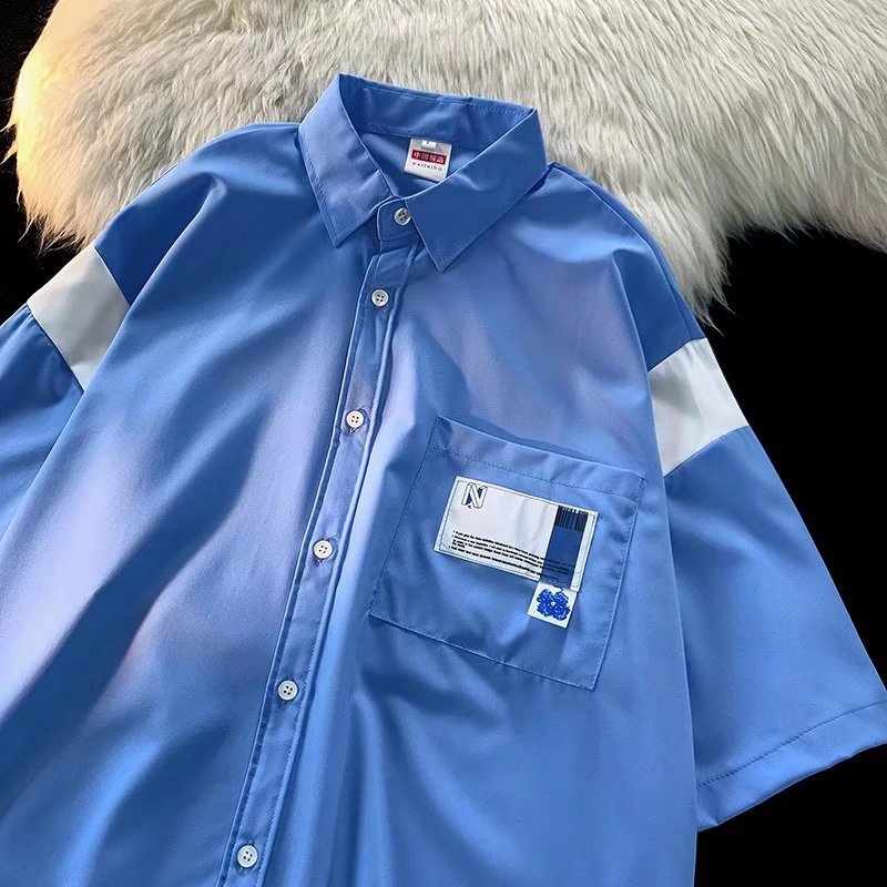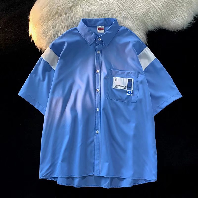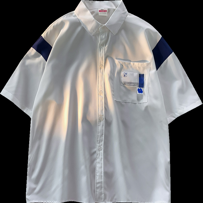 冰丝短袖口袋衬衫男高街垂感白衬衣小众设计感情侣装拼接半袖上衣
