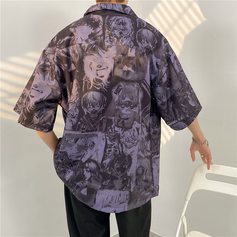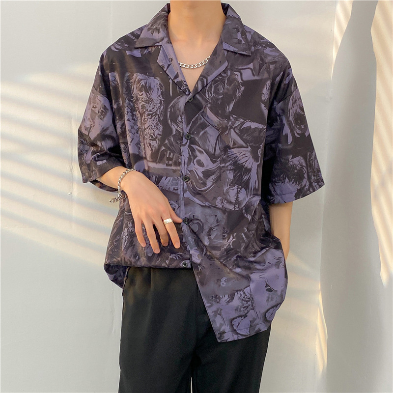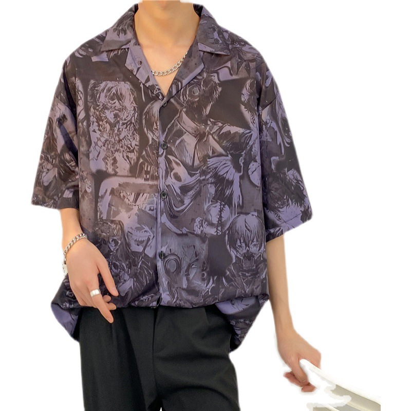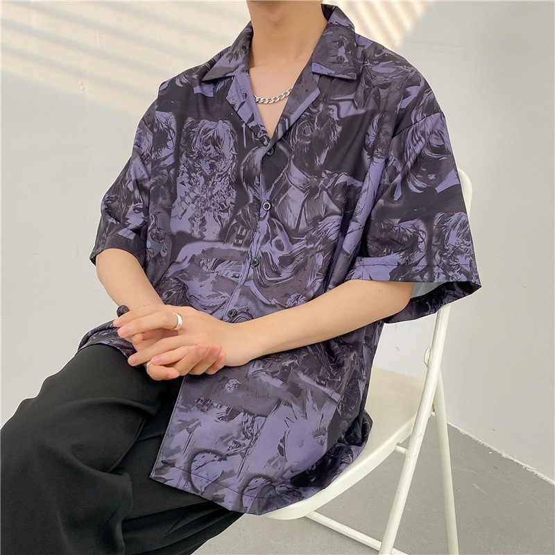 欧美设计感个性印花五分袖衬衫男女夏季宽松情侣垂感冰丝半袖衬衣
