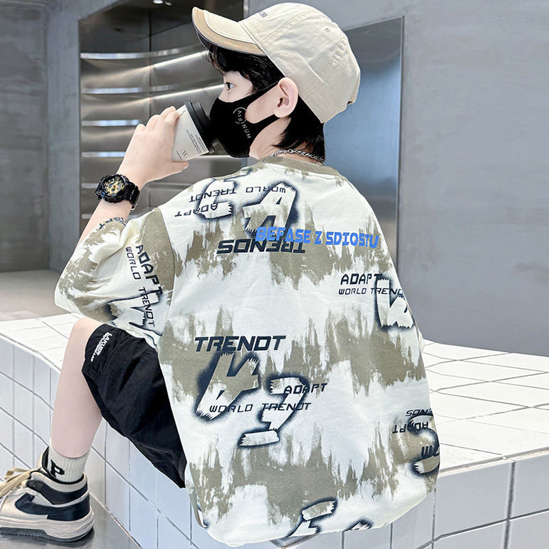 儿童装男童夏装T恤棉质新款中大童潮范夏季圆领短袖印花扎染上衣