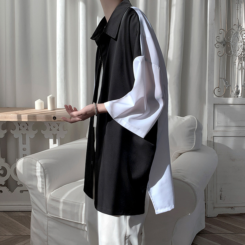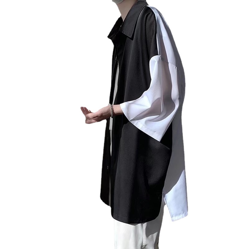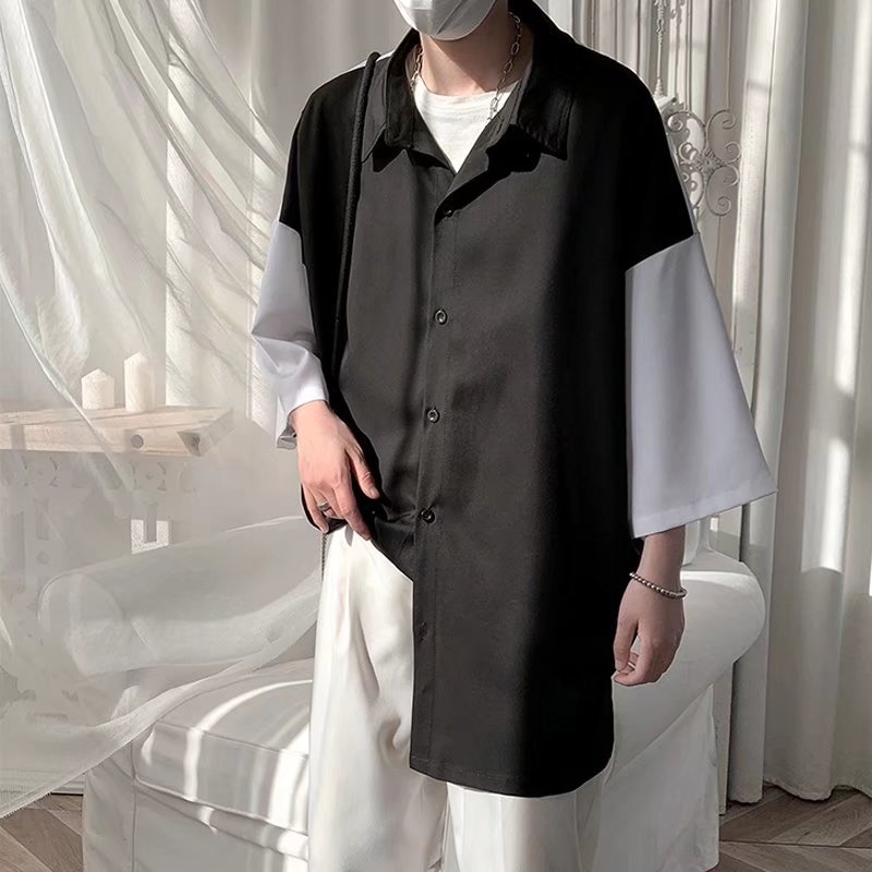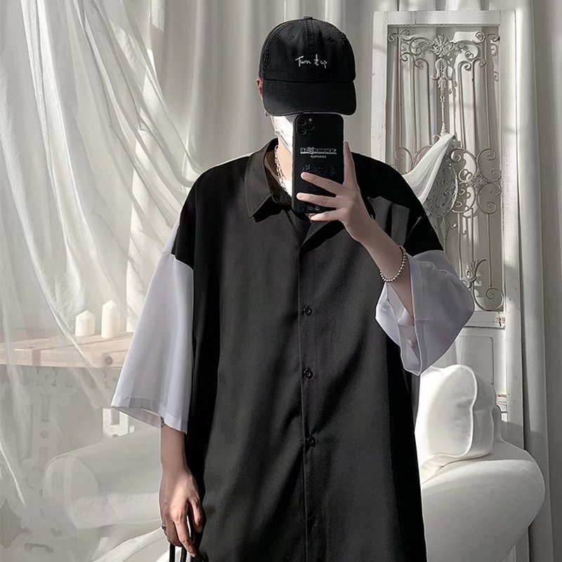 夏季新款冰丝短袖衬衫男设计感小众拼色七分港风宽松潮牌休闲衬衣