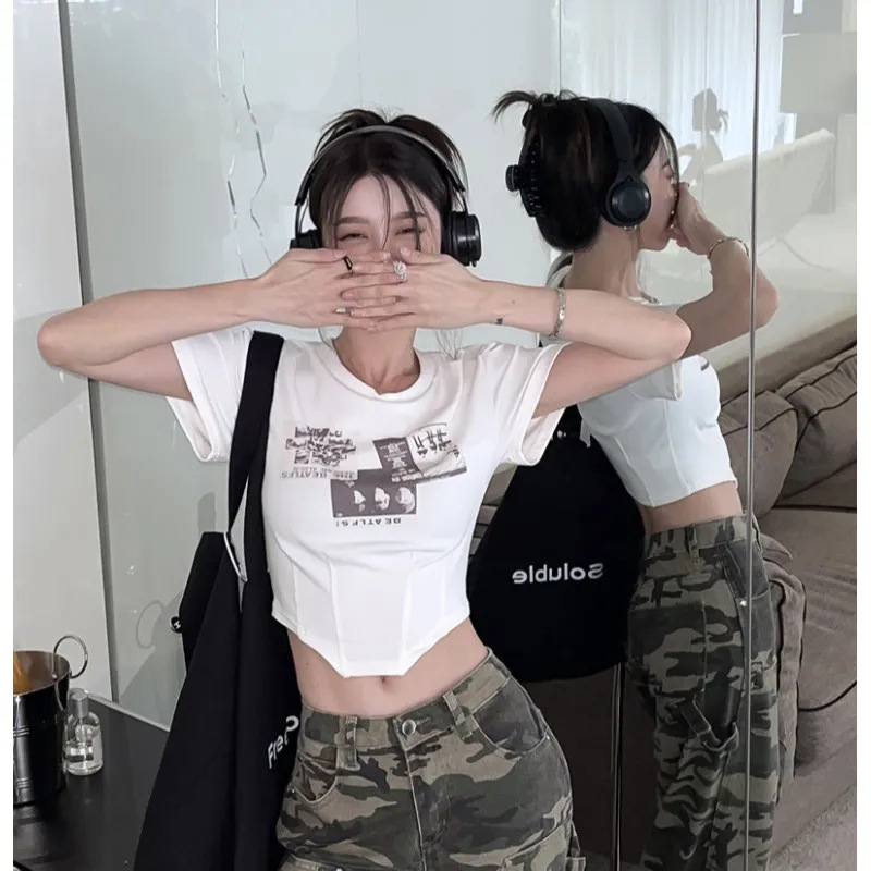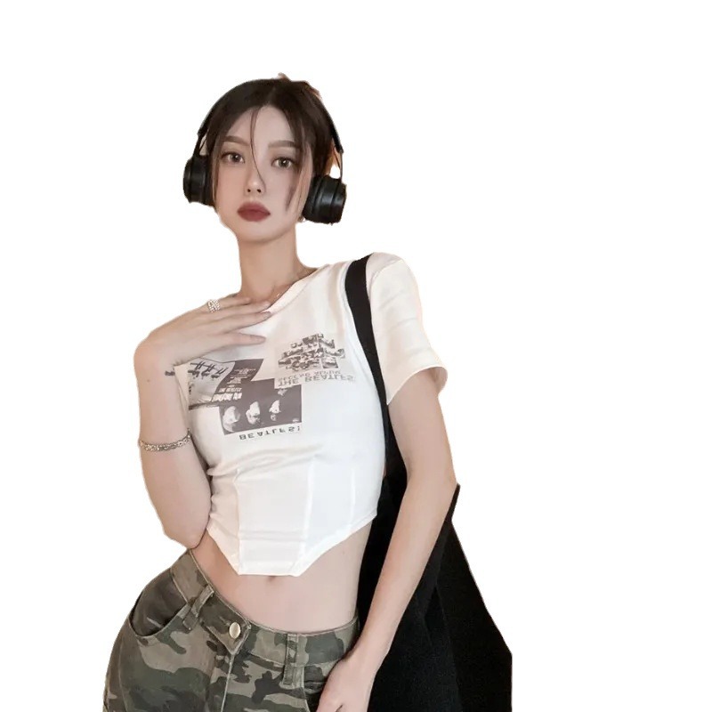 纯棉短款不规则正肩短袖T恤女夏露脐鱼骨设计感纯欲欧货辣妹上衣