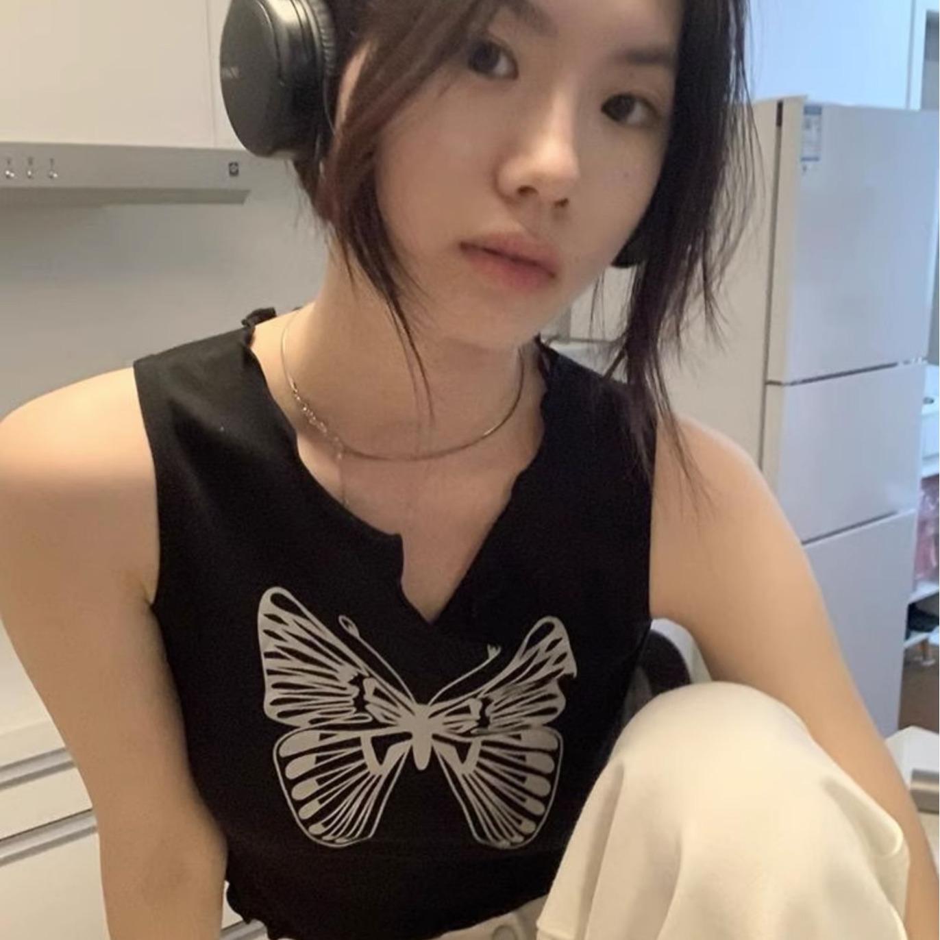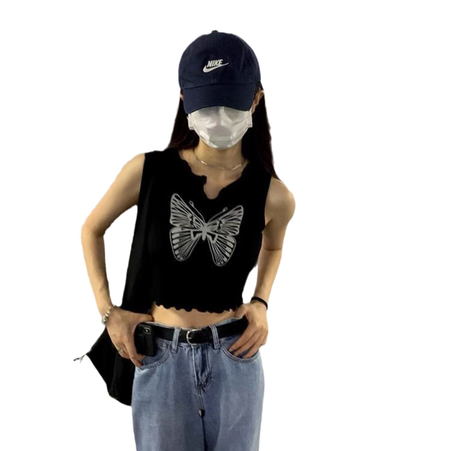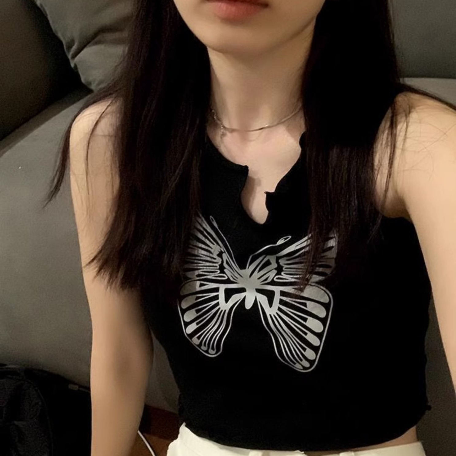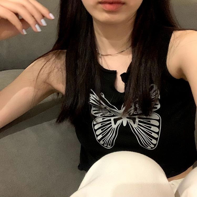 复古黑色蝴蝶印花无袖背心女外穿潮春季2025新款花边修身短款上衣